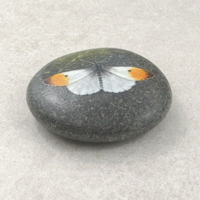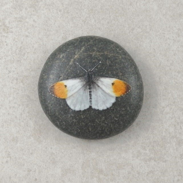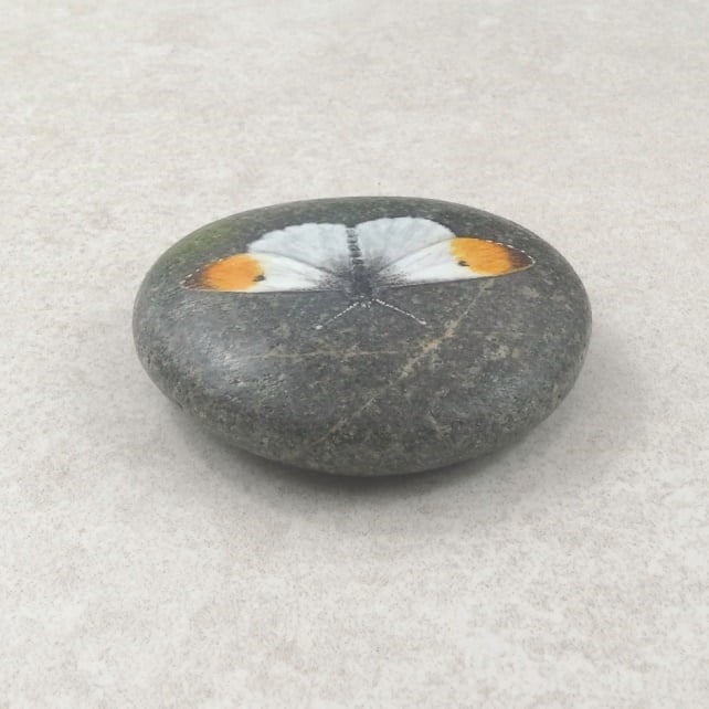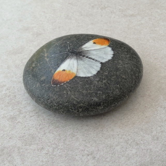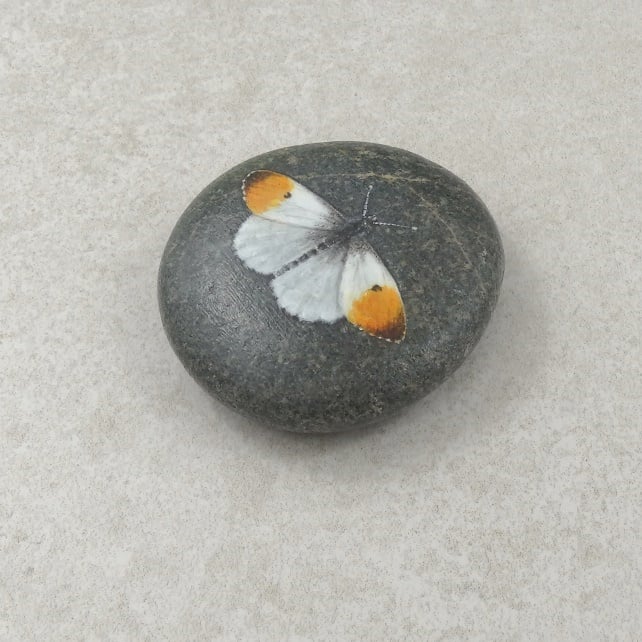 My Orange tipped butterfly stone has been painted in quality acrylic paints and finished with three coats of acrylic sealer which gives them a smooth tactile finish.