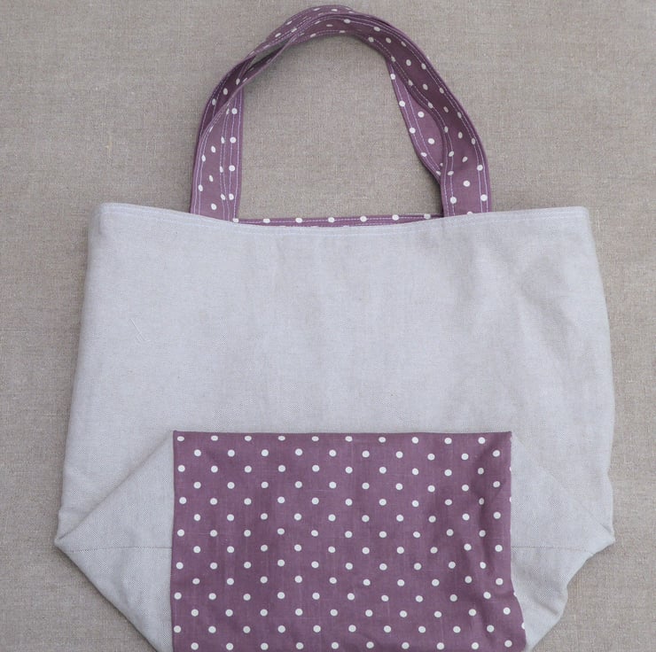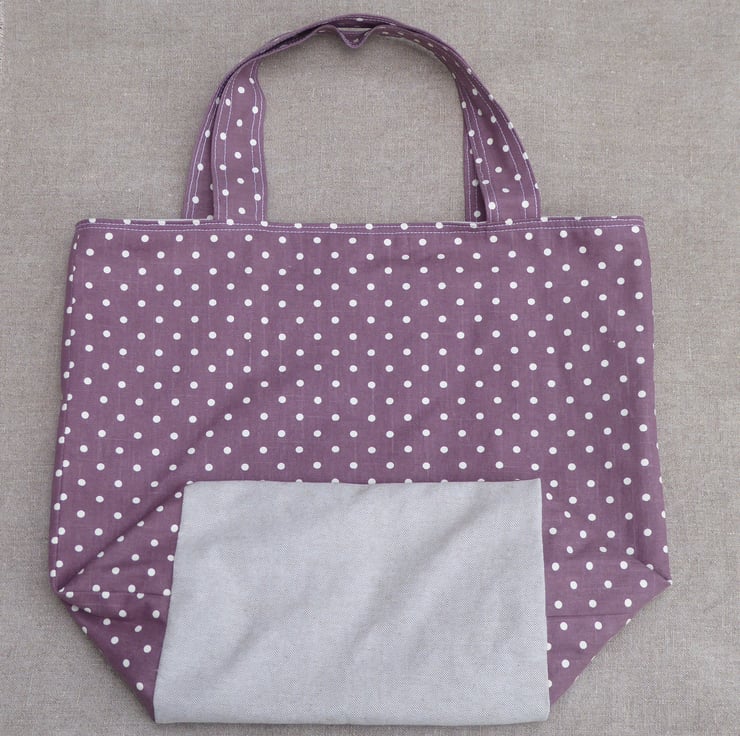 This purple spotted with white is such a lovely, subtle fabric. It took me a while to find the perfect plain fabric to go with it. This is a go anywhere bag, and, if you like purple, the perfect one for you.