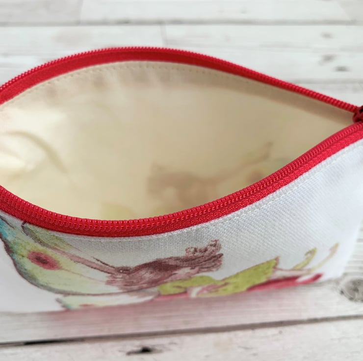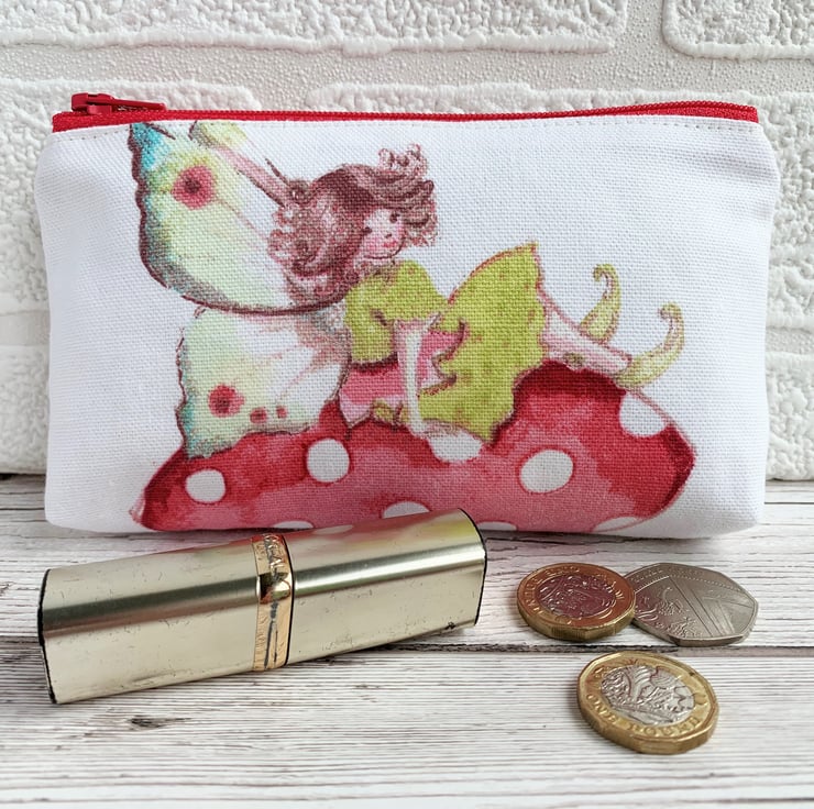 A large purse in print fabric with a pattern depicting a fairy sitting on a toadstool. The pattern, on a white background, features a fairy in a lime green dress with a pink sash. She has brown hair and wings of white, yellow and blue with pink spots. She is sitting on a Fly Agaric mushroom in red and pink with white spots. The coin purse has a fuschia pink zip and is lined with cream fabric. The base of the purse is boxed to give extra space inside.