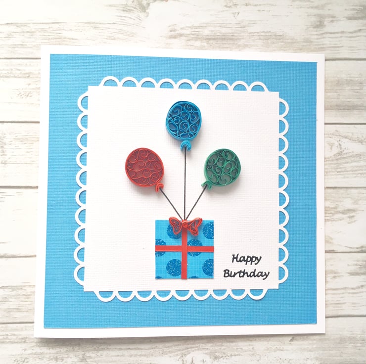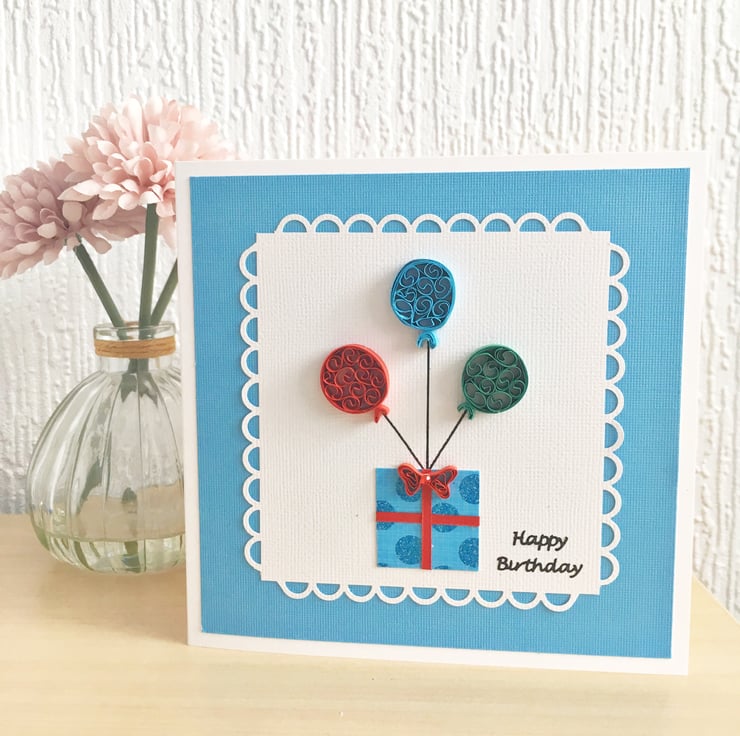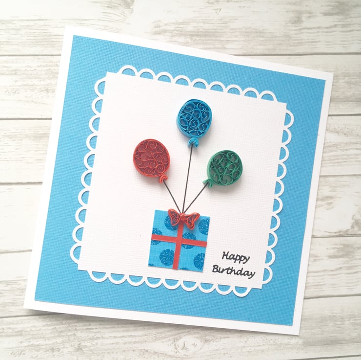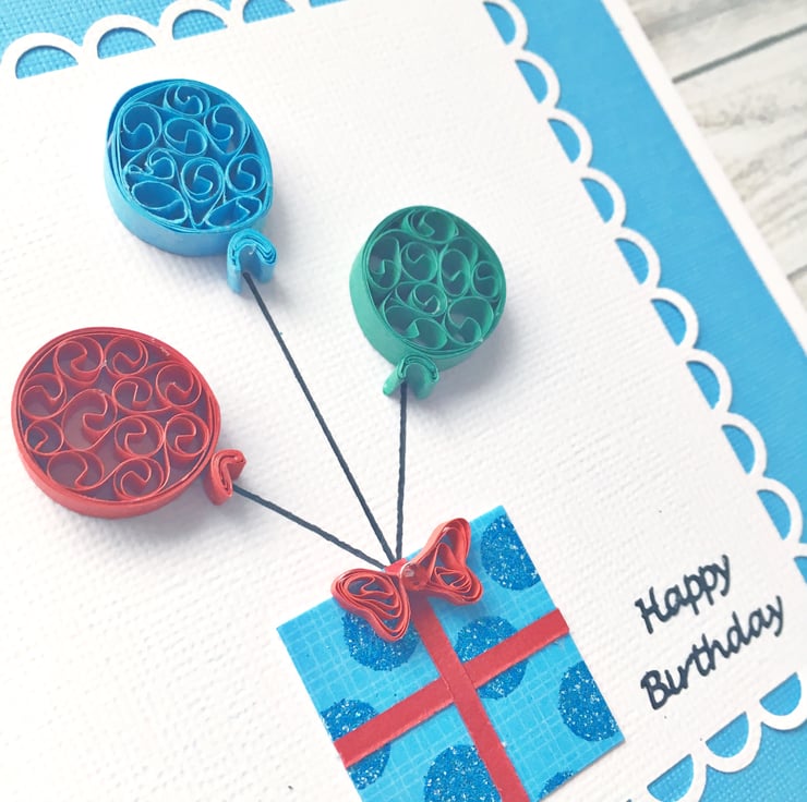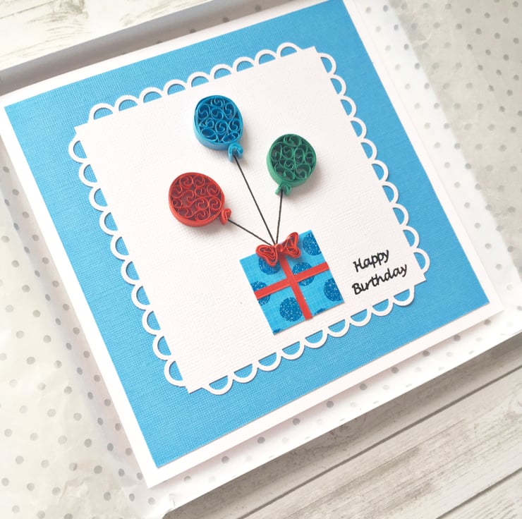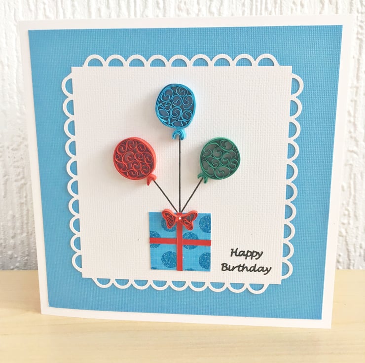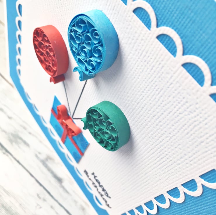 This card features three quilled balloons in red, blue and green and a lightly glittered blue dotted gift box topped with a red quilled embellished bow.