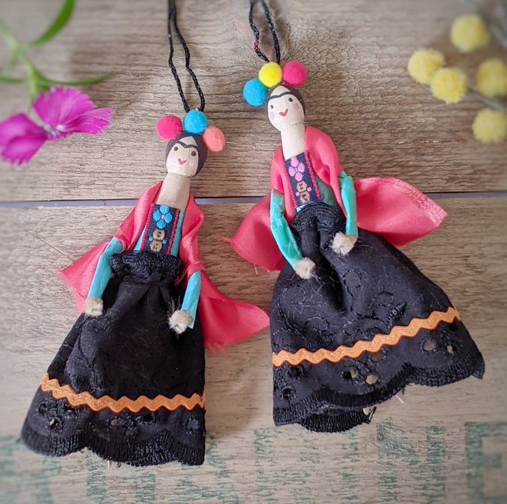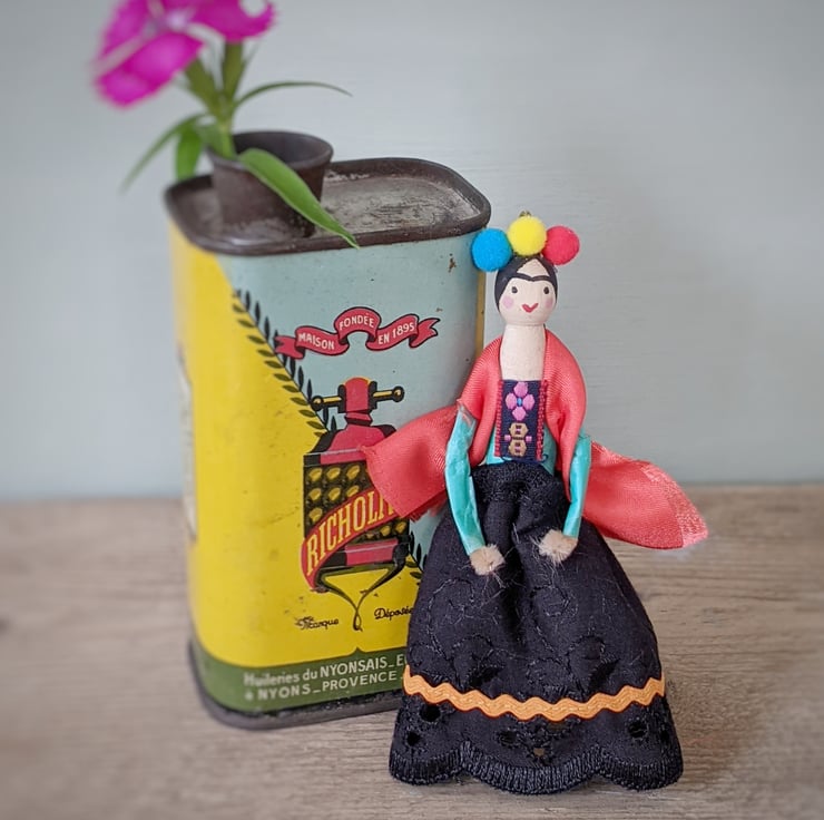 Your Frida Khalo hand painted peg doll comes with a ricrac skirt, embroidered top, pom pom hair decoration and a silky shawl.