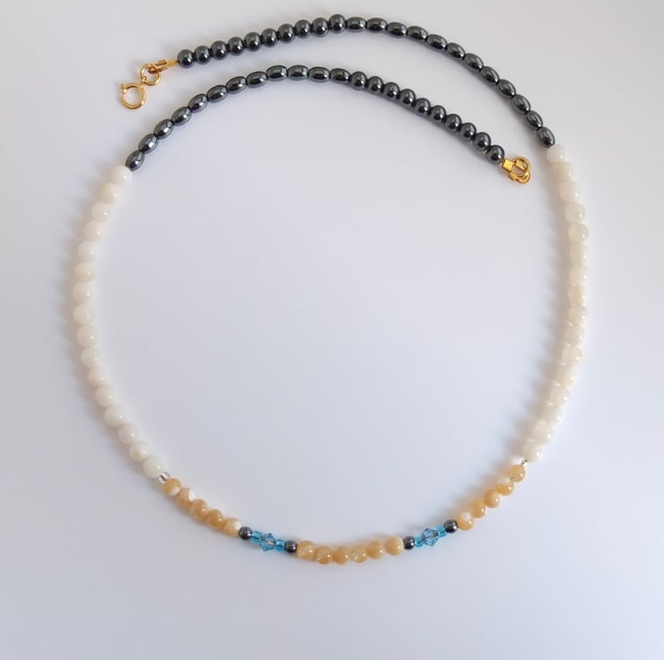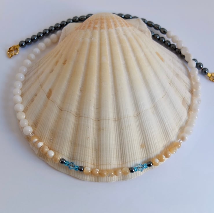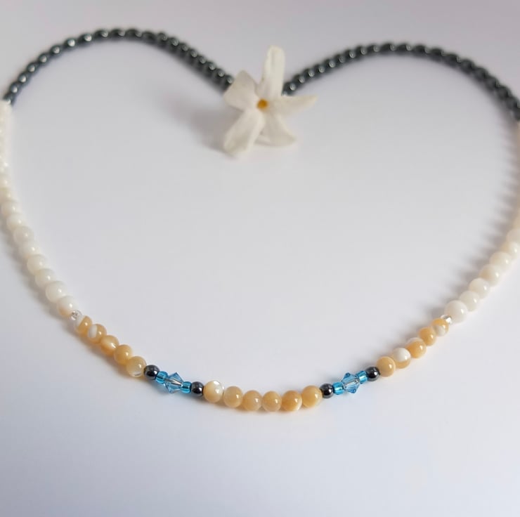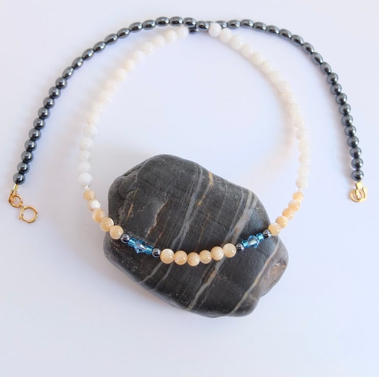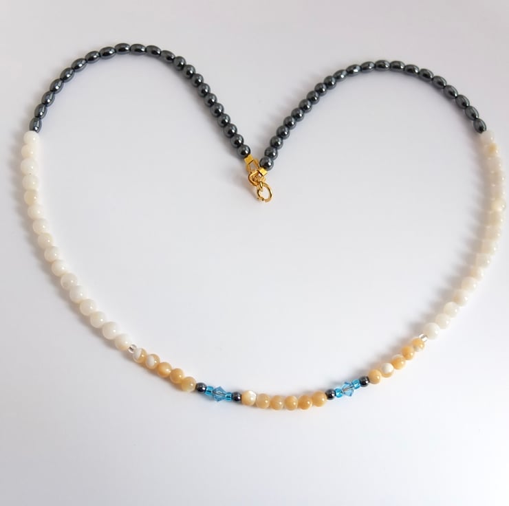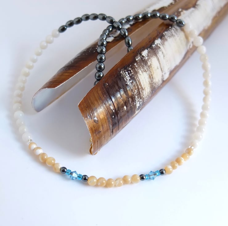 Striking design featuring creamy-golden mother-of-pearl, white shell and hematite beads with two 'aquamarine' top quality Austrian crystals highlighted with bright blue glass seed beads and small hematite rounds, inspired by my favourite seabird, the gannet.