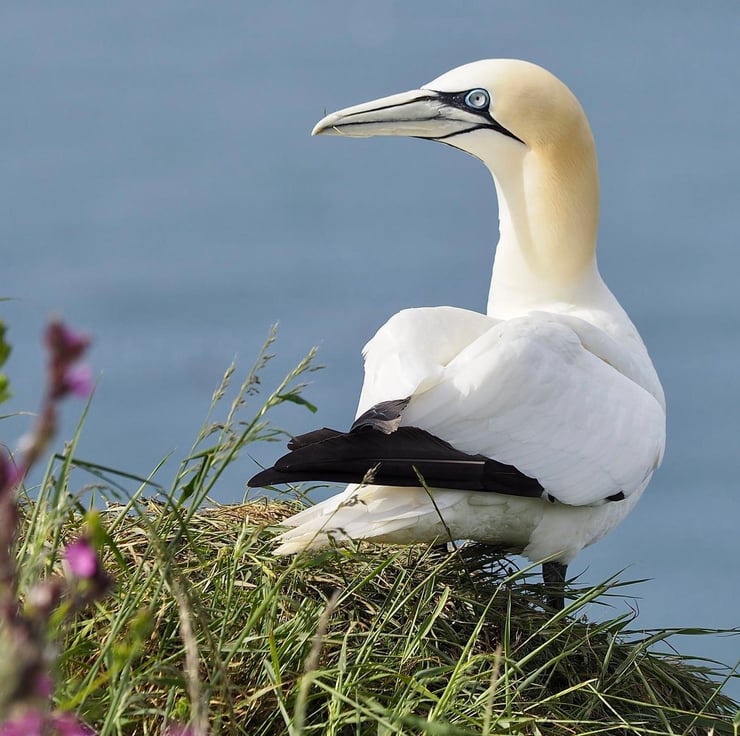 One of my favourite seabirds, the gannet has bright blue eyes set in a creamy-yellow head, with brilliant white body plumage that contrasts with jet black wing-tips.