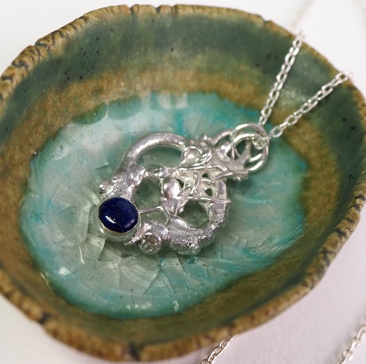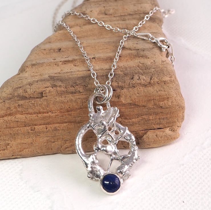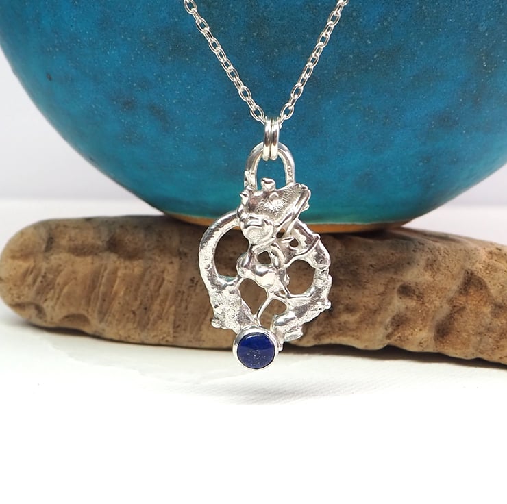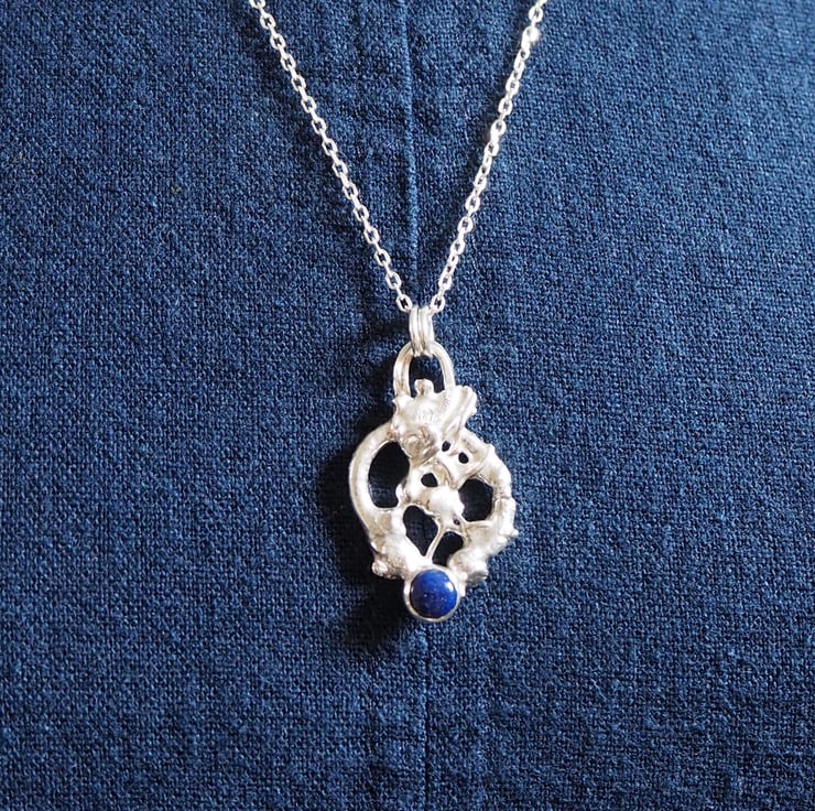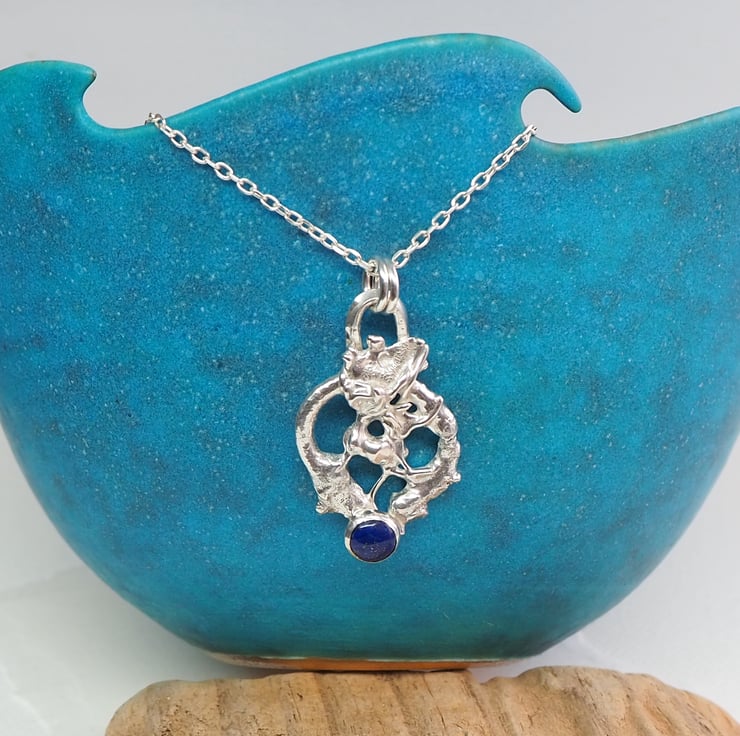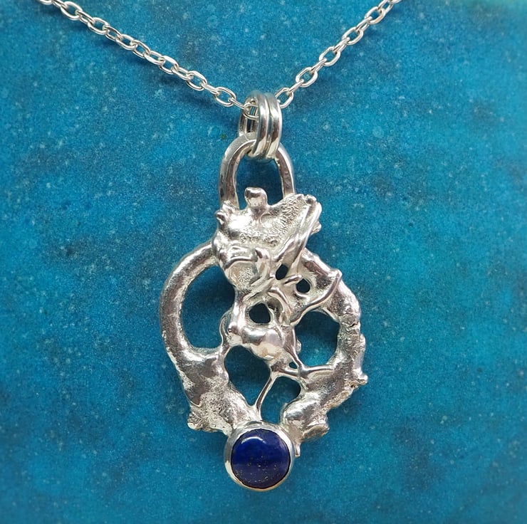 This pendant has a lovely raw organic feel to it. I have polished the silver to a bright shine and set a lovely dark blue lapiz lazuli as a focal point.