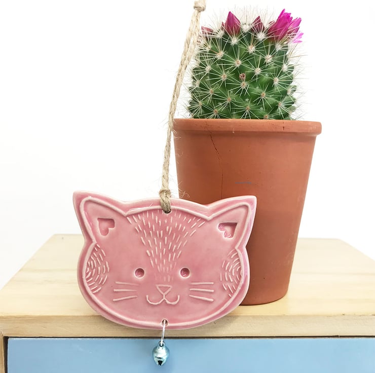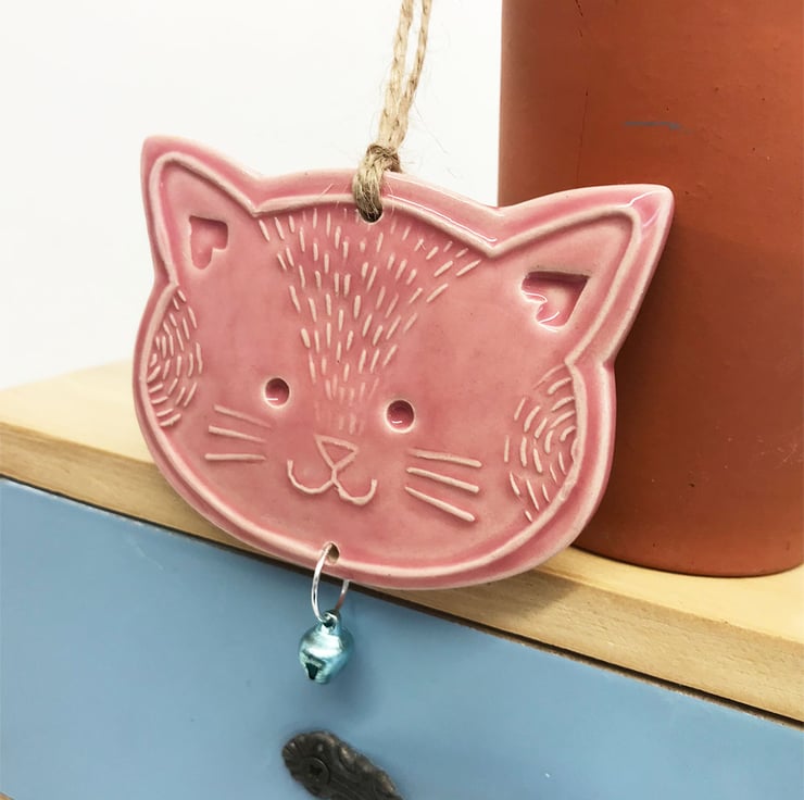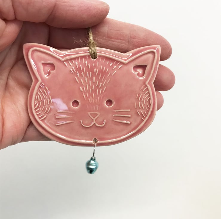 This cute little pottery cat been hand-cut and stamped from my own design. It is made from white earthenware clay, decorated and fired. It has then been glazed with a lovely glossy glaze and fired again to 1100 degrees. It hangs from a brown string. 7cm wide x 5.5cm high x 0.8cm deep.