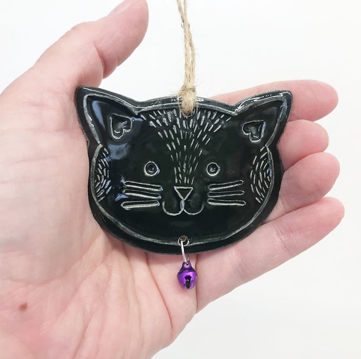 This cute little pottery cat been hand-cut and stamped from my own design. It is made from white earthenware clay, decorated and fired. It has then been glazed with a lovely glossy glaze and fired again to 1100 degrees. It hangs from a brown string. 7cm wide x 5.5cm high x 0.8cm deep.