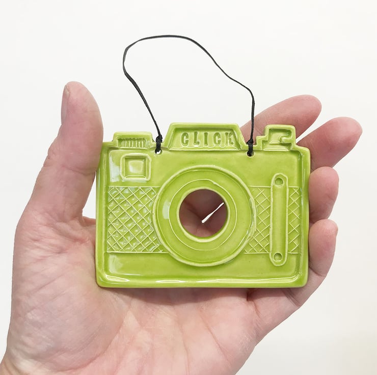 This little pottery camera has been hand-cut and stamped from my own design. It is made from white earthenware clay, decorated and fired. It has then been glazed with a lovely glossy glaze and fired again to 1100 degrees. It hangs from a black string. 8cm wide x 6.5cm high x 0.8cm deep.