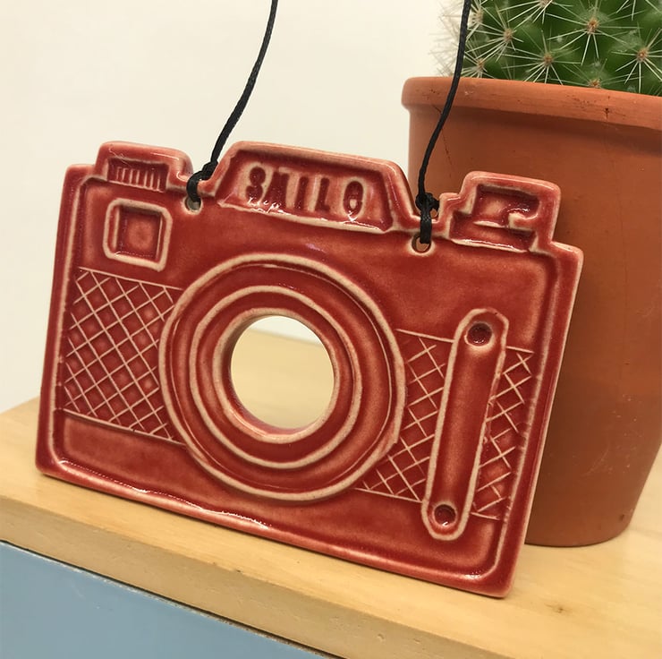 This little pottery camera has been hand-cut and stamped from my own design. It is made from white earthenware clay, decorated and fired. It has then been glazed with a lovely glossy glaze and fired again to 1100 degrees. It hangs from a black string. 8cm wide x 6.5cm high x 0.8cm deep.