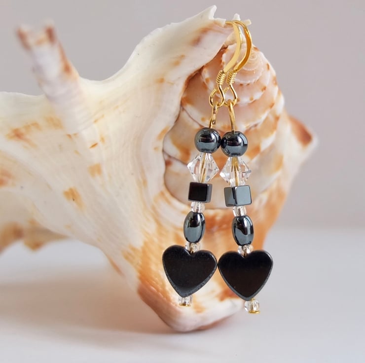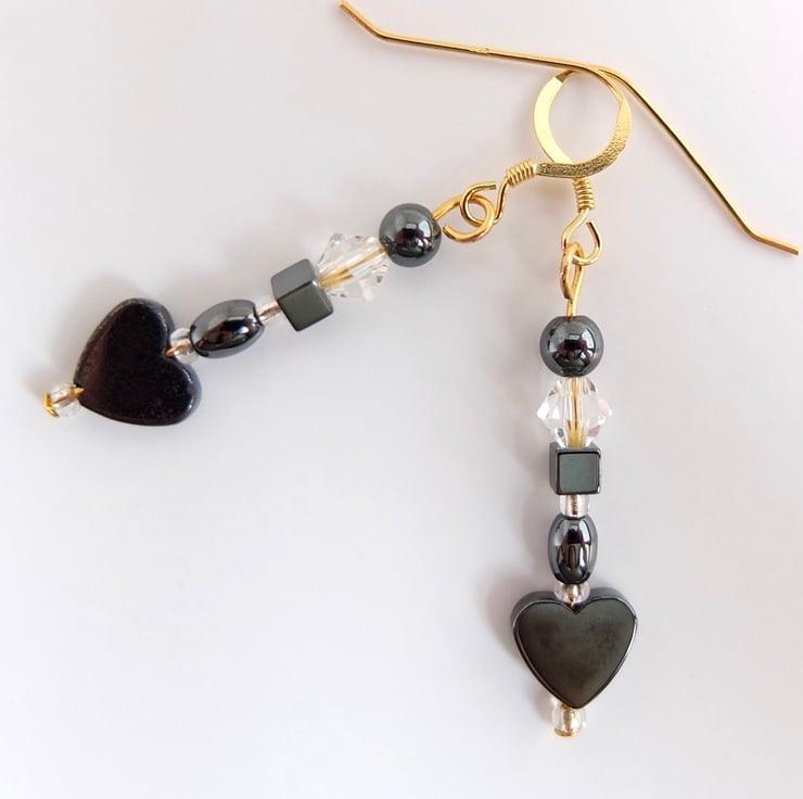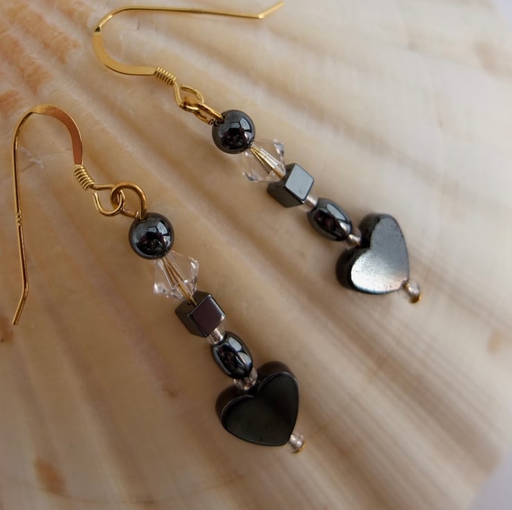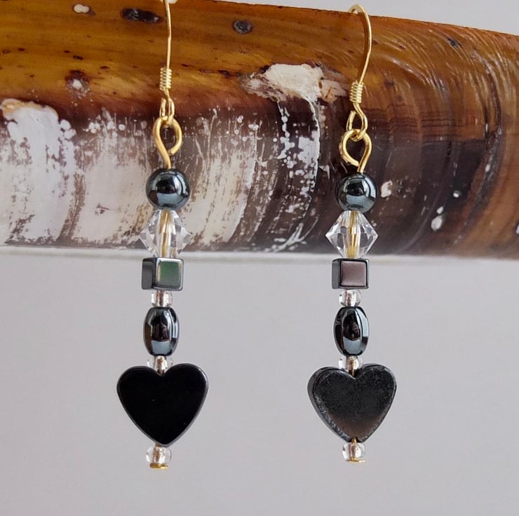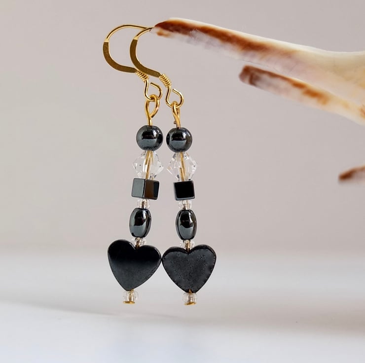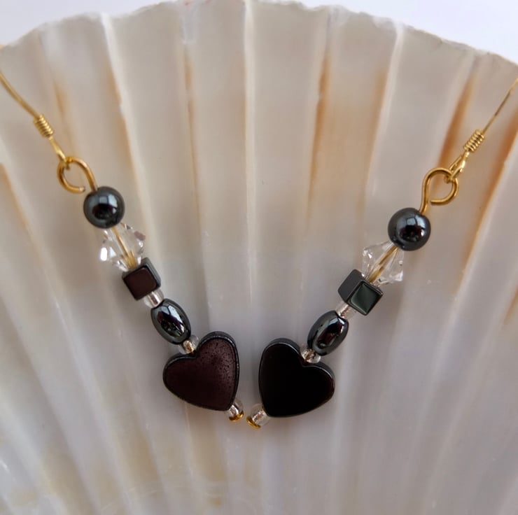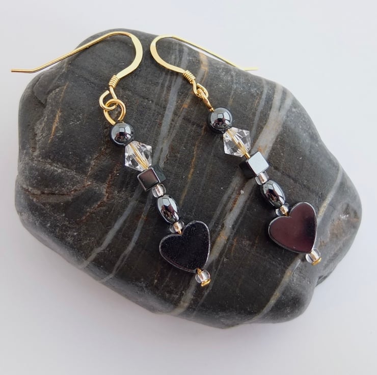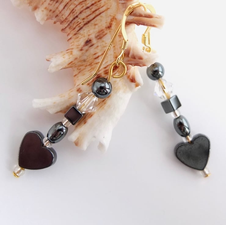 An 8mm hematite heart dangles below assorted shaped hematite beads with a 5mm clear Swarovski crystal in between for extra sparkle.
