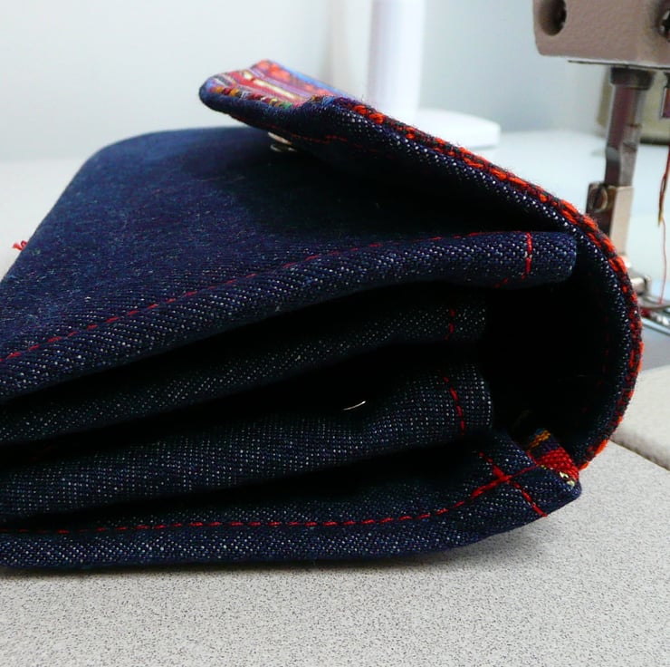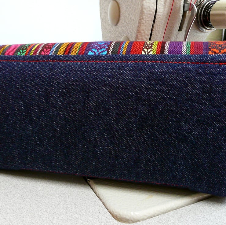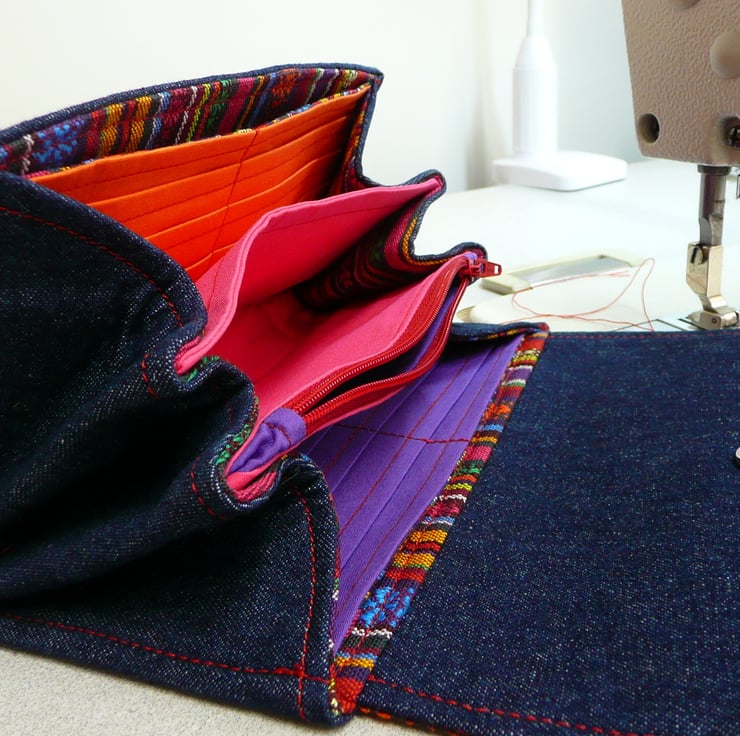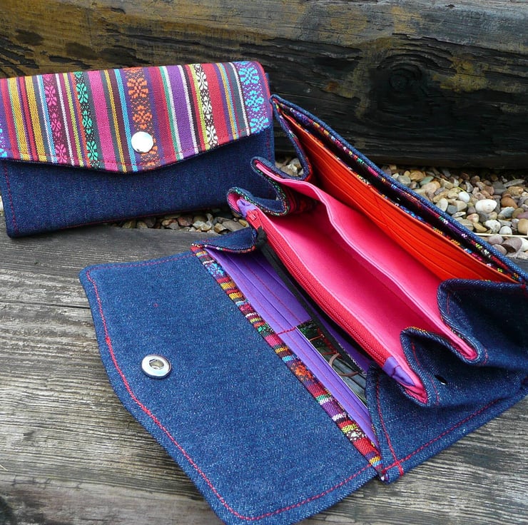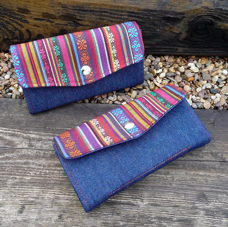 Made from multicolored stripe cotton and Indigo denim, this large purse comprises of 12 credit card slots 2 large slots for notes, ( one at the back and one at the front ) a zip section for your small change and space in the centre for a small bottle of hand sanitizer, it fastens with a very strong snap fastener on the front and finished off with rivets on the side to create the compartments.