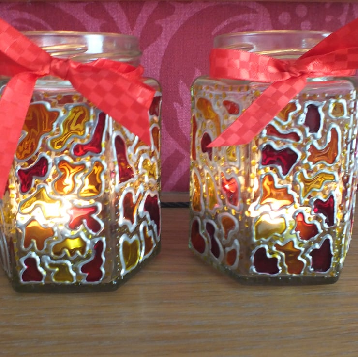 I love candles and I love to find unusual holders for them. I was given the hexagonal jars and thought they would look fabulous painted. So I further indulged myself by painting them in colours I love. I think they may have a Christmassy feel to them!