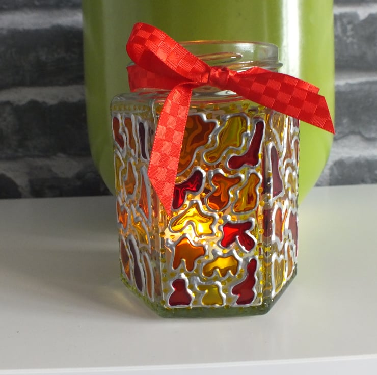 This up-cycled glass jar which I have painted using glass paints and out-liners could be used for any of the above!