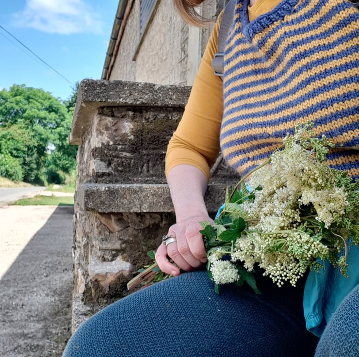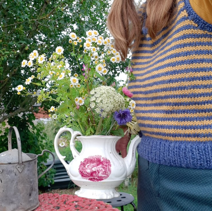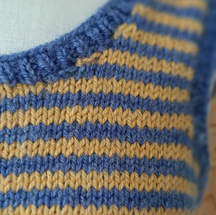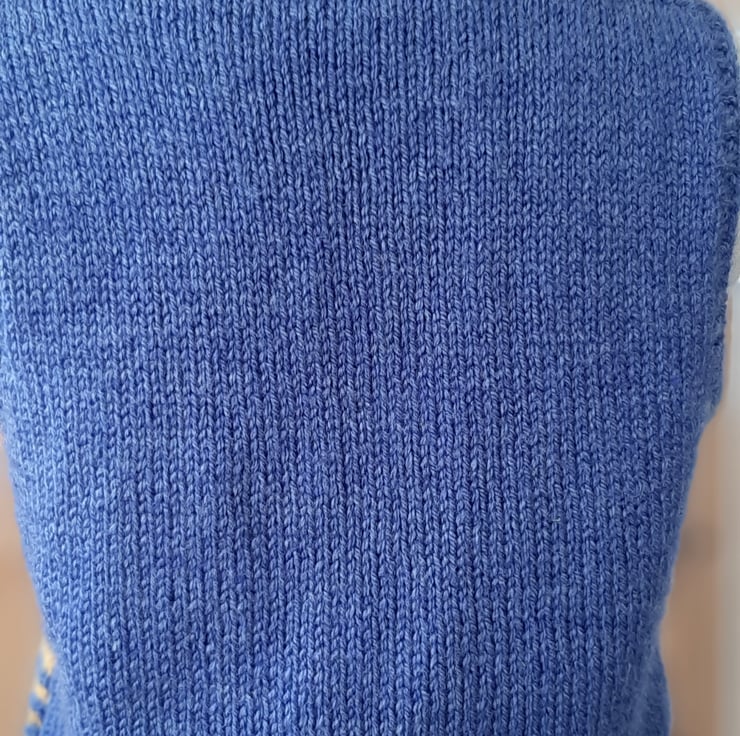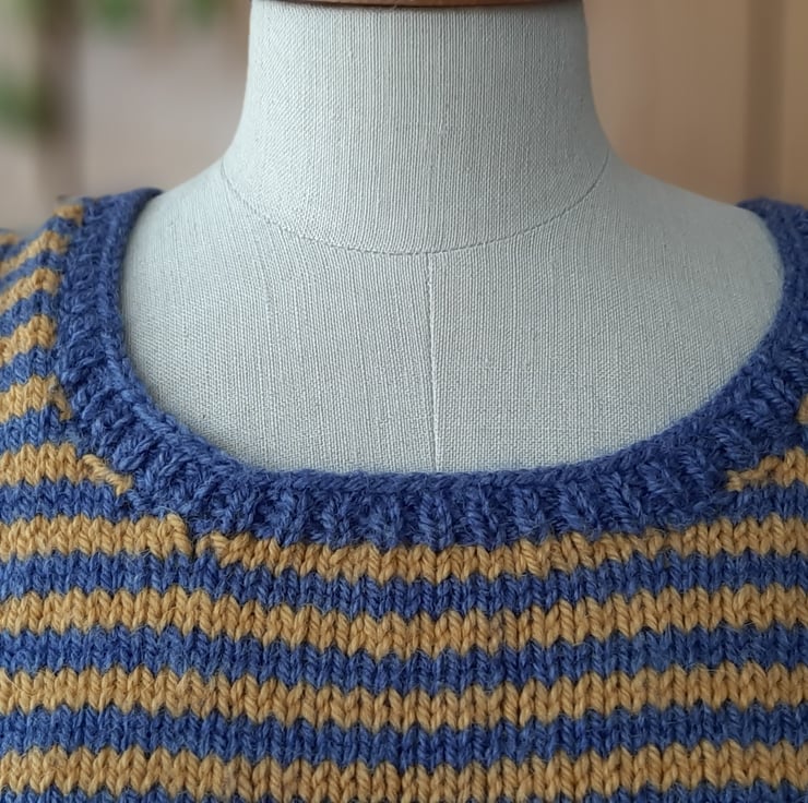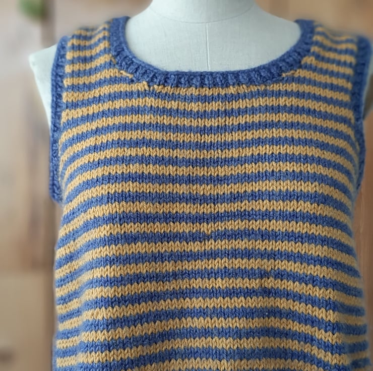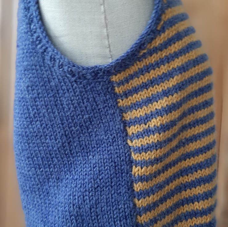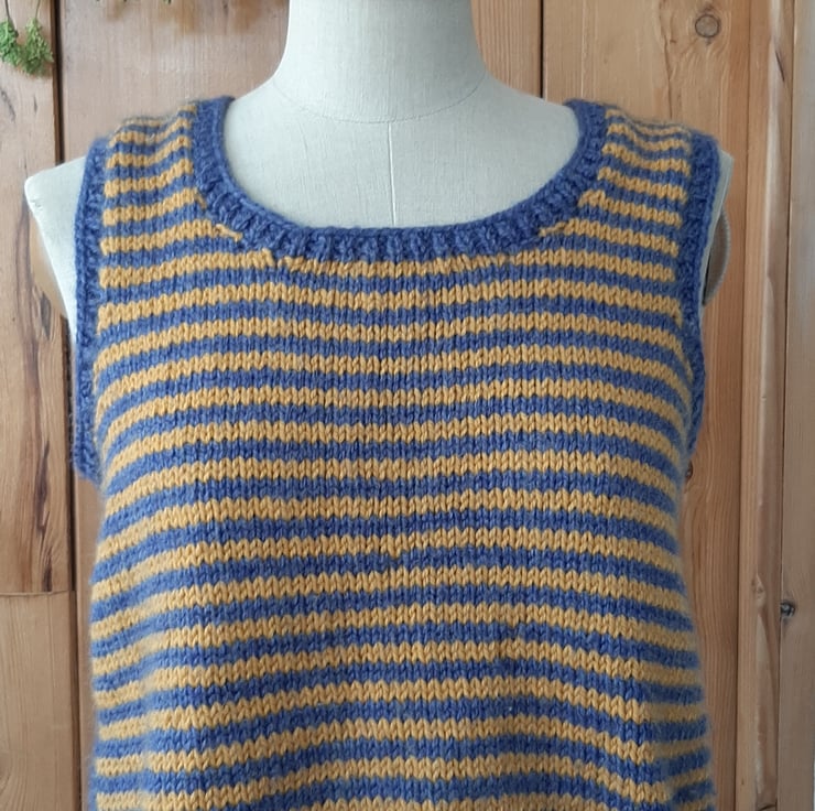 In sunny golden yellow and blue. Beautifully knitted by Linda aka bodkins mum. This is a size 12 could fit a 10 and s tight fit on a 14. Measuring 44cm arm pit to arm pit. Length from the top of back to the bottom of waist band 46 cm .
