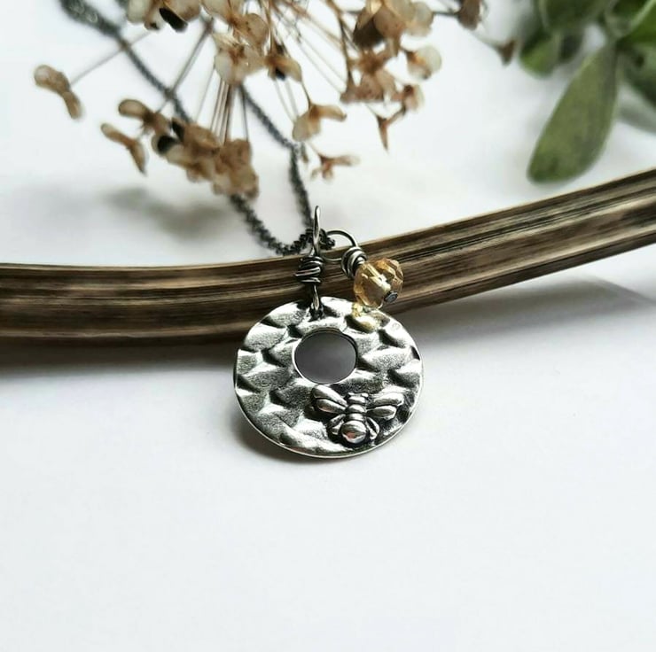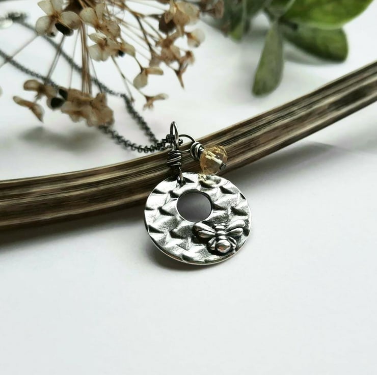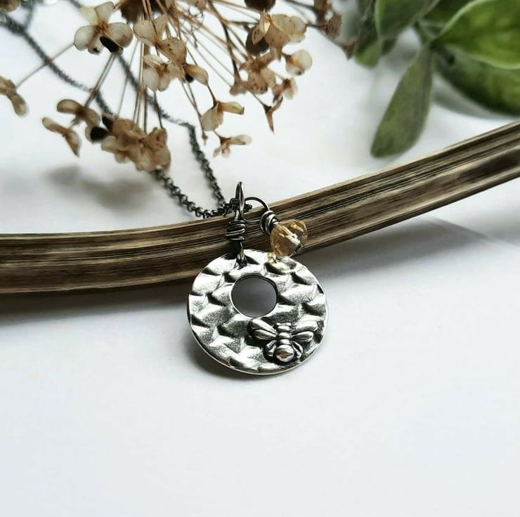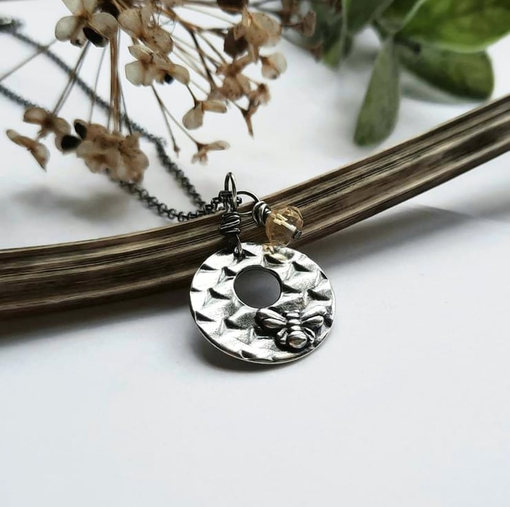 The bee pendant is teamed with a sterling silver wire wrapped yellow citrine gemstone charm and the whole necklace is oxidised with a jeweller's patina to highlight the details.