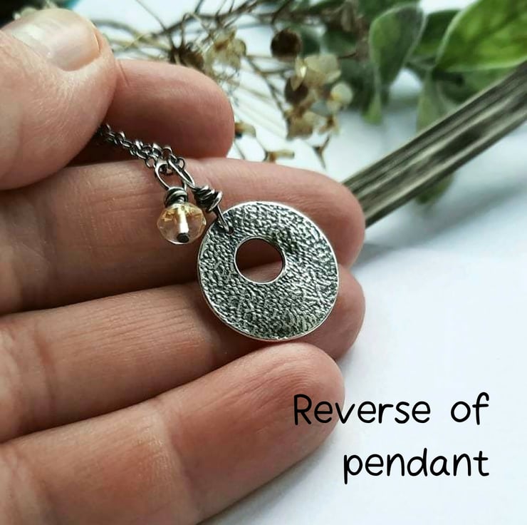 The round pendant is textured and cut to shape. The little bee is moulded from the clay and securely attached to the pendant which is then sanded, drilled and kiln fired, before being tumbled in a barrel polisher to a high shine. The pendant and wire wrapped gemstone charm are then suspended from a sterling silver chain.