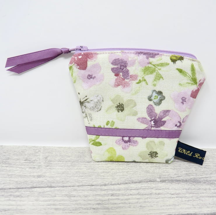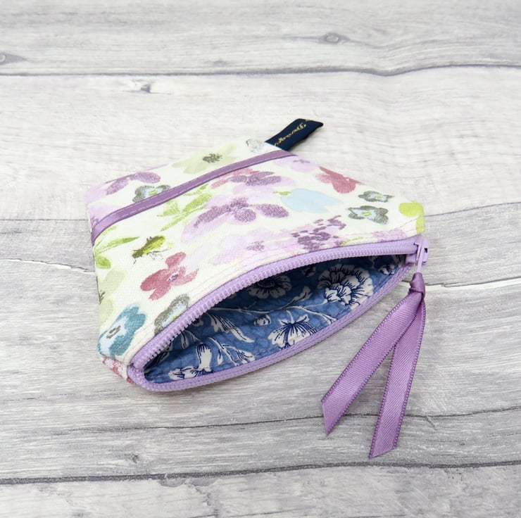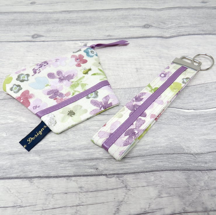 This pretty purse and key fob gift set is handmade in a floral cotton in shades of lilac, green and blue. The zipped purse has a lilac ribbon trim and zip pull, whilst the lining is a blue floral print.
