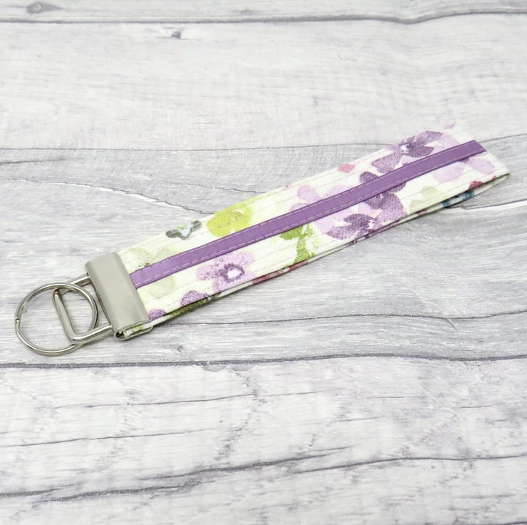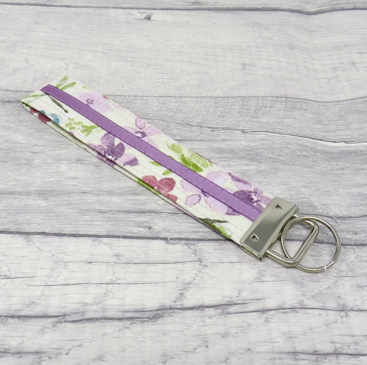 Set into a sturdy metal bar with a ring attached, the key fob also has a lilac ribbon trim.