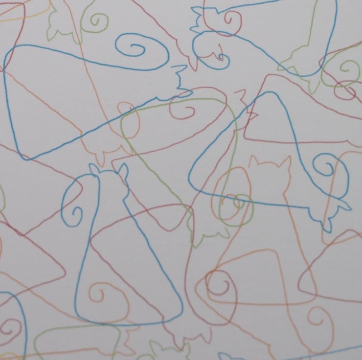 I love the way these simple colourful cats tumble across the page like confetti. They’re great fun to draw as I do them in one simple line.