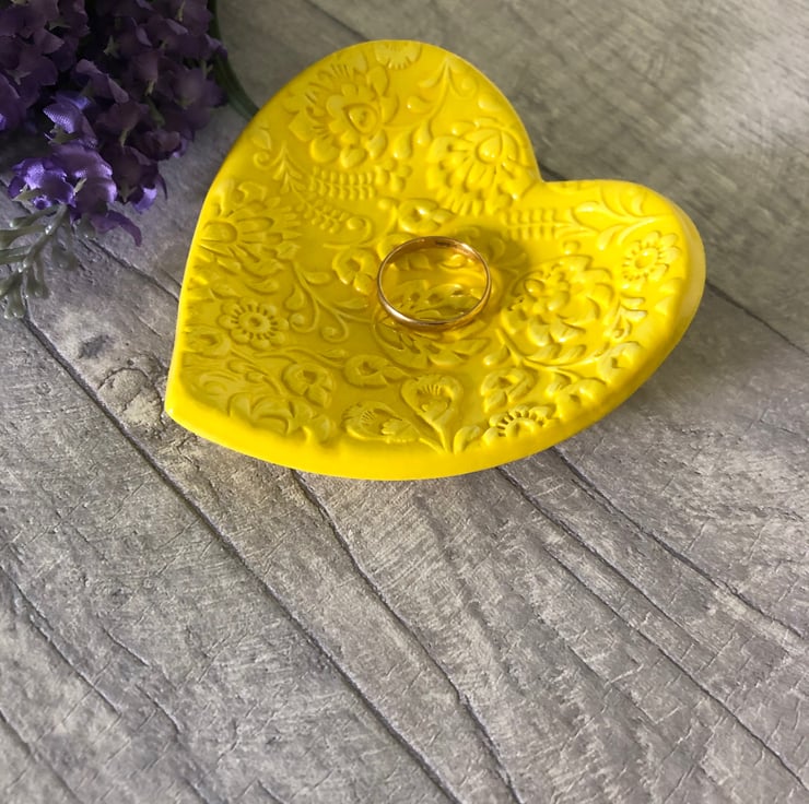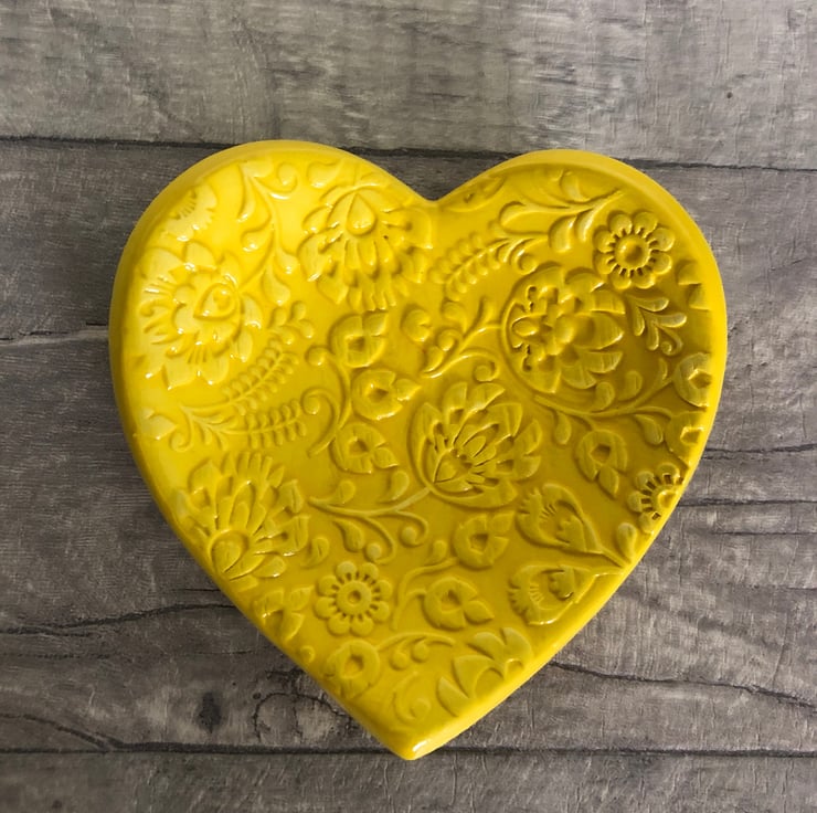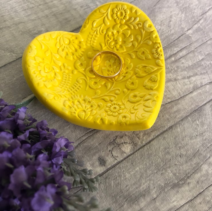 The dish has been individually made by rolling out clay and then rolling the flower pattern onto the clay. Next I cut the heart shape out using a cutter and shaped it into a dish form. Once dried the clay was then fired in my kiln. Once fired to bisque ware, I painted the colour on it in underglazes, then clear glazed it and gave it it’s final firing.