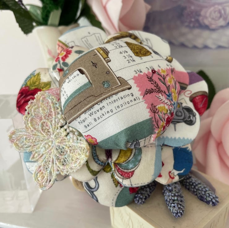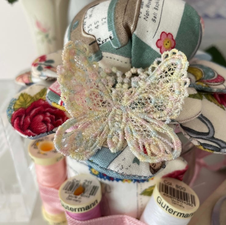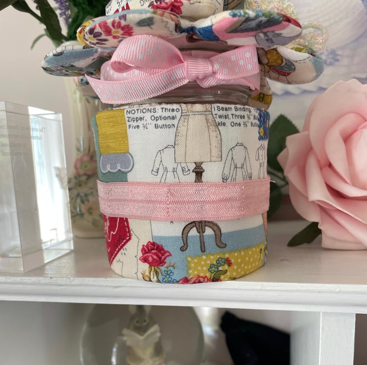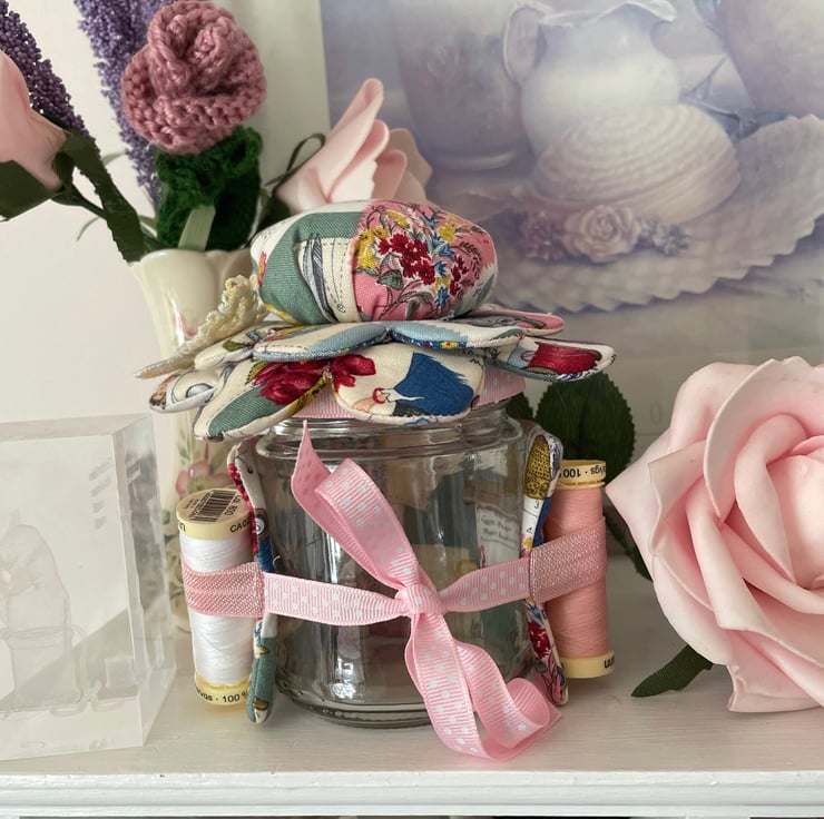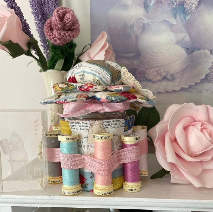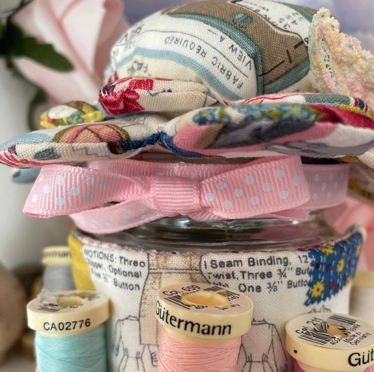 Delightful vintage style sewing fabric covering a jar, with elastic straps to hold reels of thread, lightly padded, tied with a pink polka dot ribbon. The lid has a polka dot ribbon round the edge with a matching bow. The top fabric petals with a pin cushion pompom on the top. A pretty lace butterfly to one edge. The jar can be used to store bobbins or packs of needles.