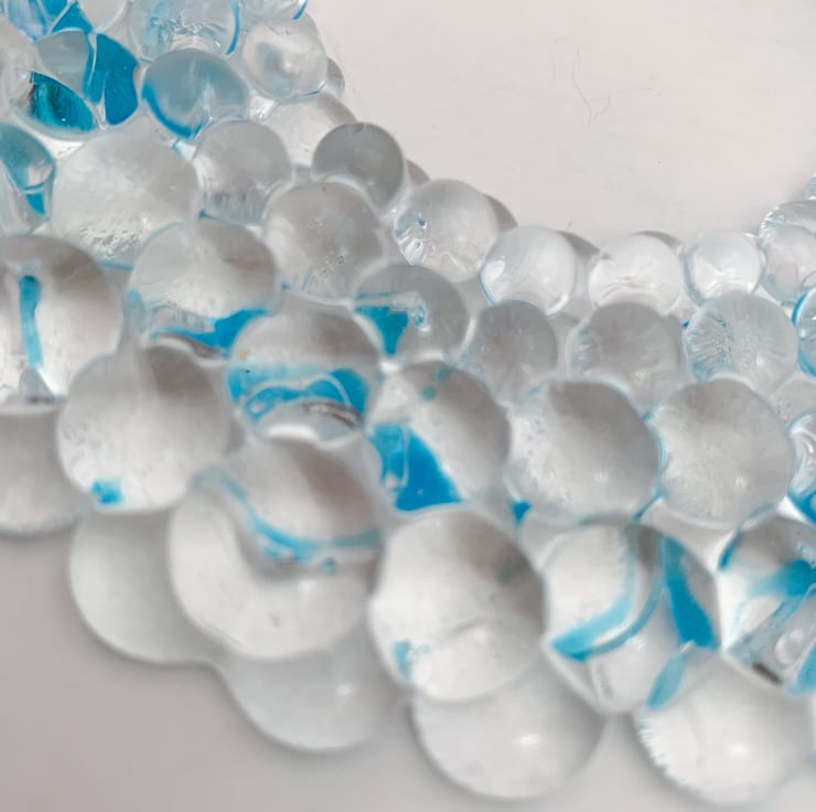 Fused glass hanging, handmade from hundreds of individually made glass balls, with a turquoise glass tint. It looks lovely when hung in a window, scattering light in interesting patterns.
