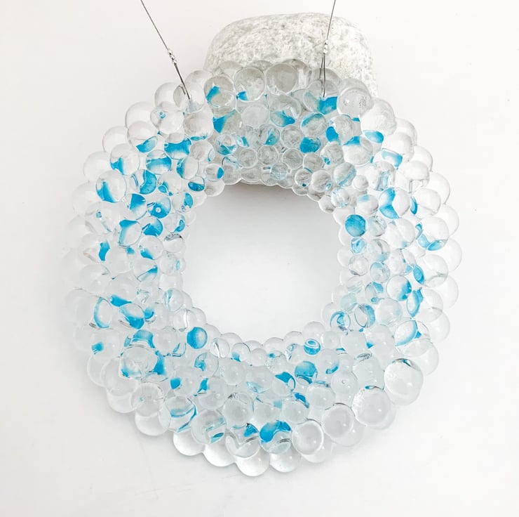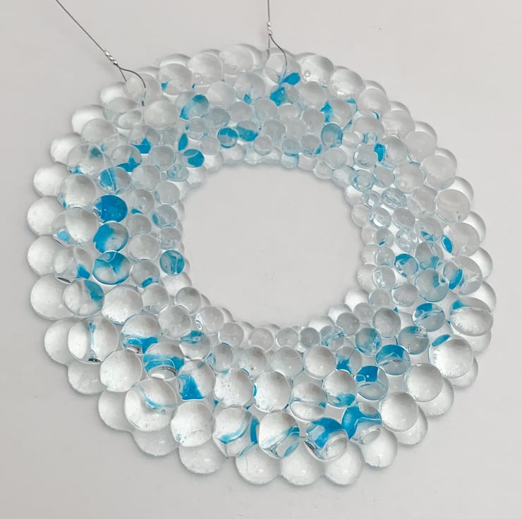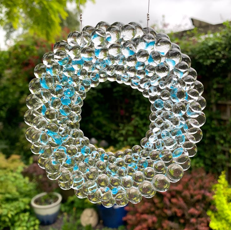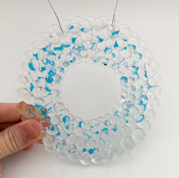 To make this hanging, I hand cut tiny little squares of transparent art glass and fired them overnight in a kiln to make little balls of glass. I then arranged the pieces into a circular shape and fired the whole thing overnight in my kiln. The next day, I added another layer of the glass balls and a turquoise tint and fired again to add strength to the glass. When cooled again, I drilled 2 holes and added the hanging wire.