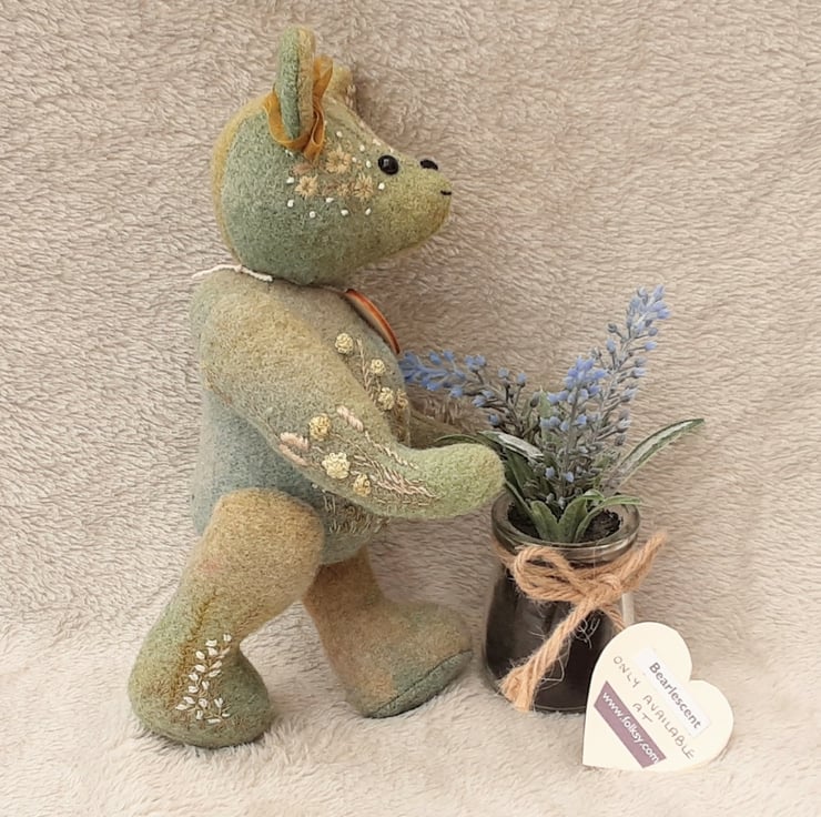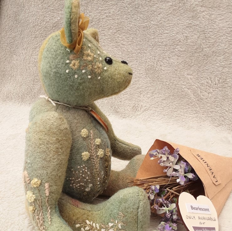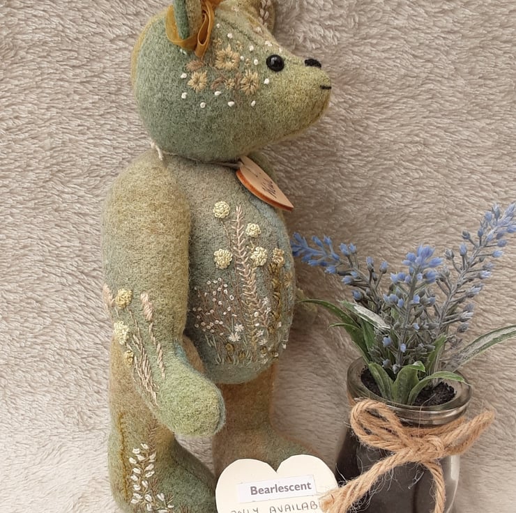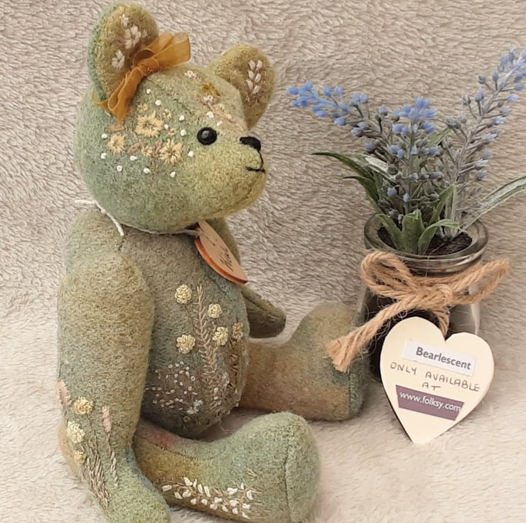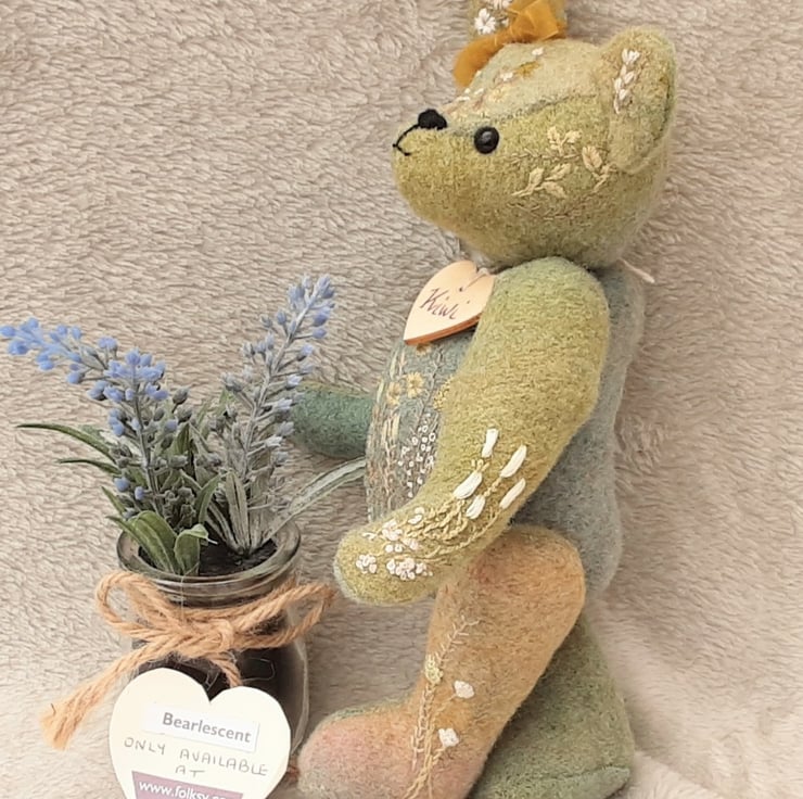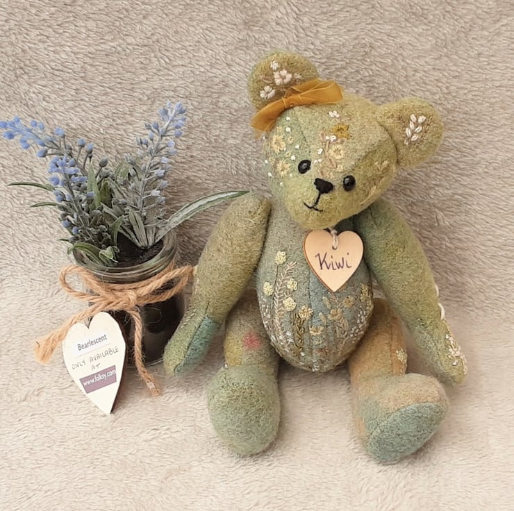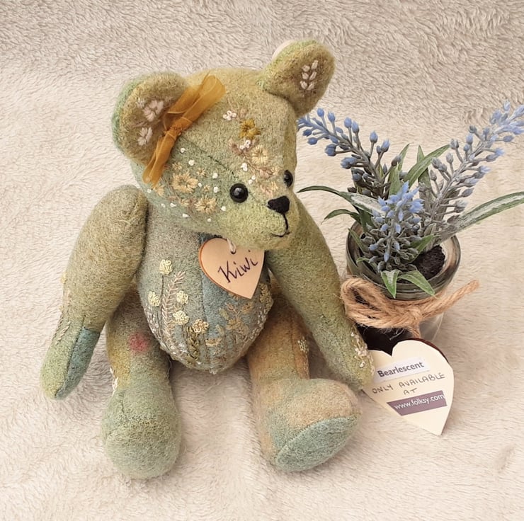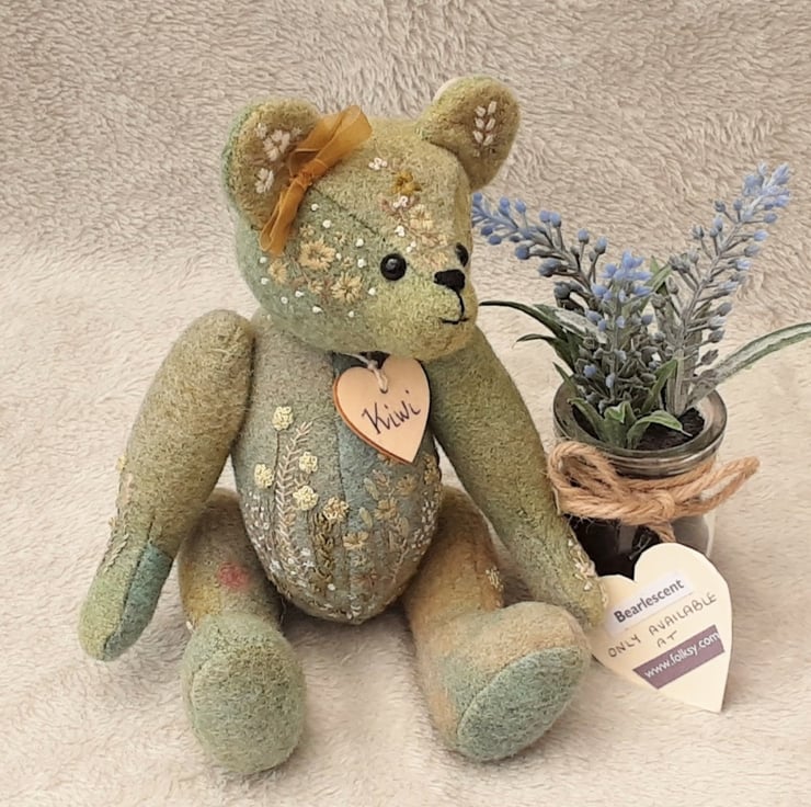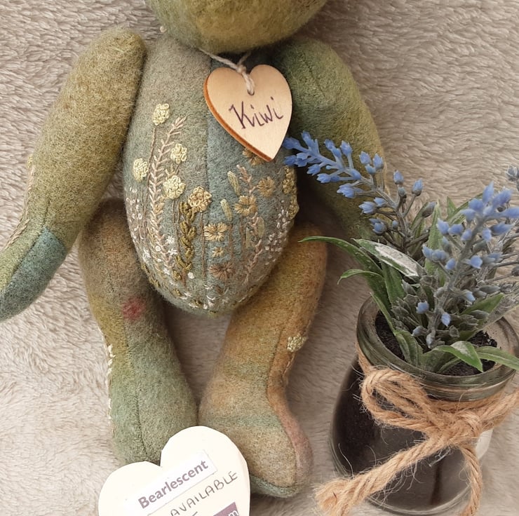 Meet Kiwi, a unique hand embroidered bear, handmade using beautiful hand dyed alpaca fabric in soft greens with hints of grey green and mustard tones and a little splash of Pink.