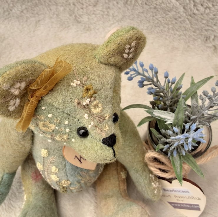 She wears her name on a wooden tag and Bearlescent is to the back of one ear on a polymer clay button.