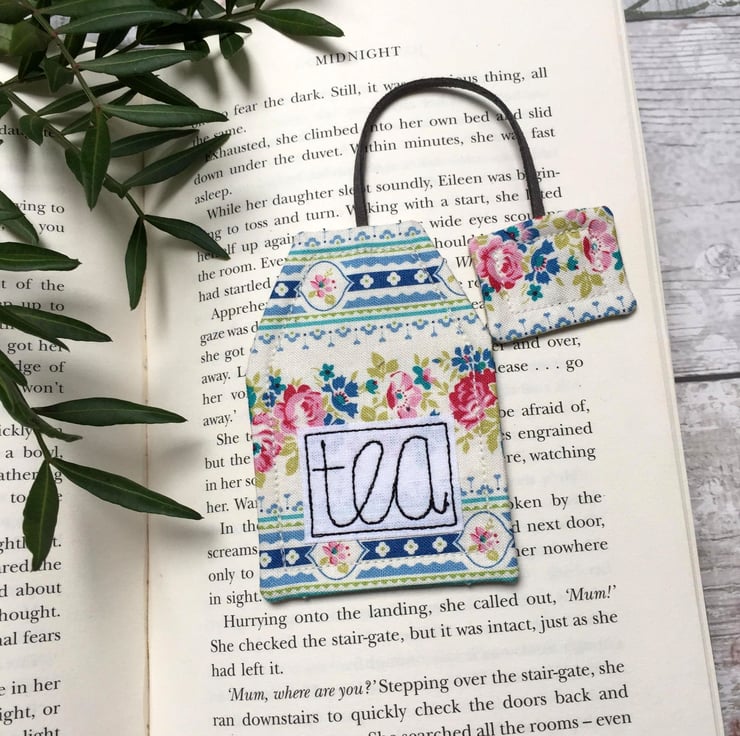 This listing is for 1 tea bag bookmark embroidered with the word 'tea'.