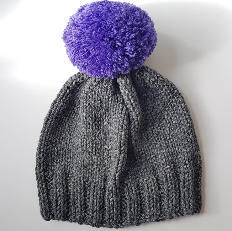 This bobble hat is hand knitted in a mid grey chunky acrylic yarn with a large ultra violet chunky and squishy pom pom sewn on.