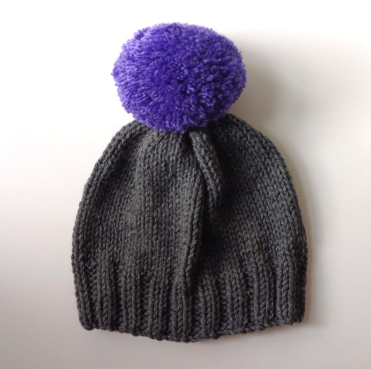 This listing is for the Bobble Hat in Mid Grey Chunky Yarn with Ultra Violet Pom Pom only.