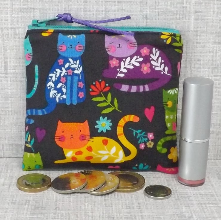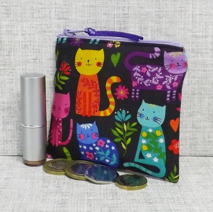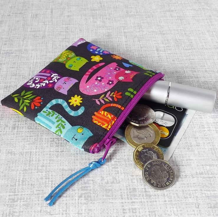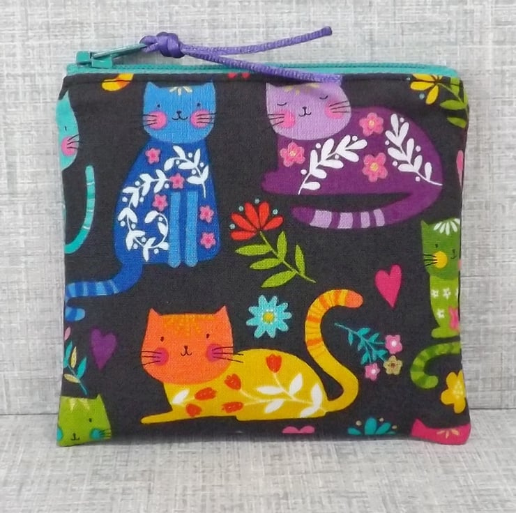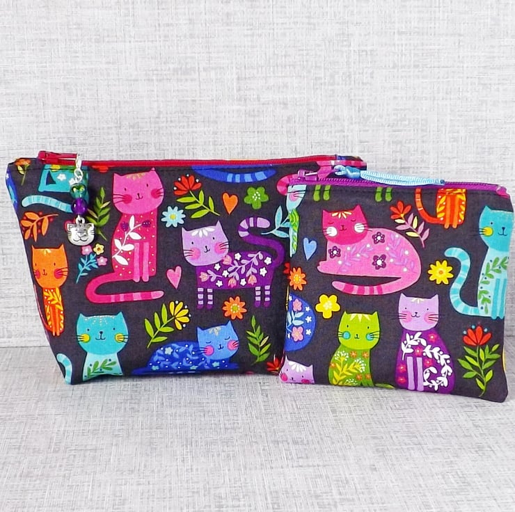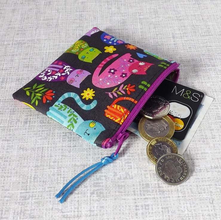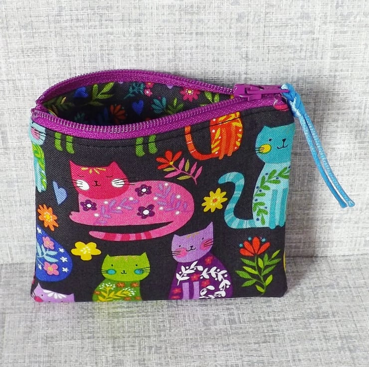 The main fabric has a vibrant cat design in shades of pink, purple, green and blue, on a dark grey background. The lining is a co-ordinating cotton fabric with a small multicoloured floral design on a dark grey background.