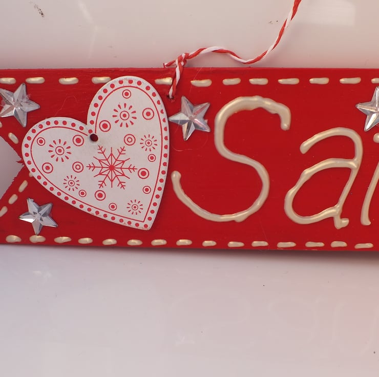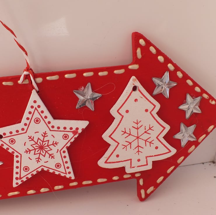 The wooden arrow has been painted red and has been adorned with star beads and wooden tree, heart and star ornaments.