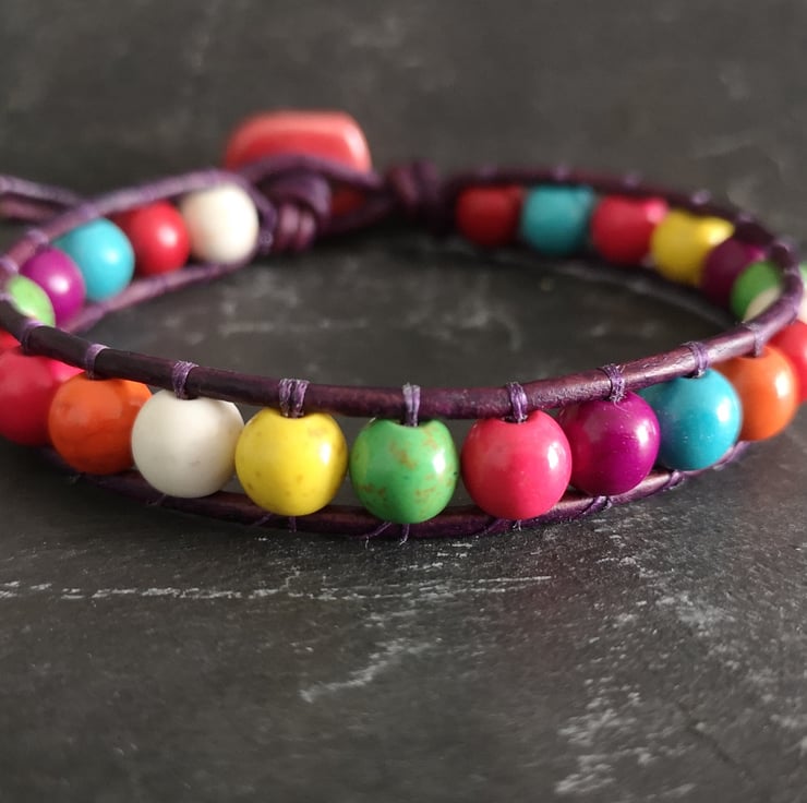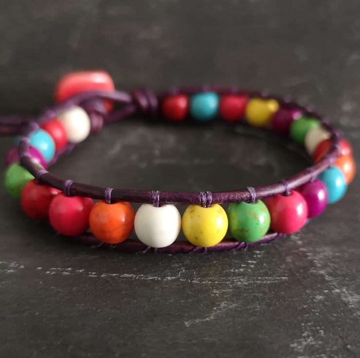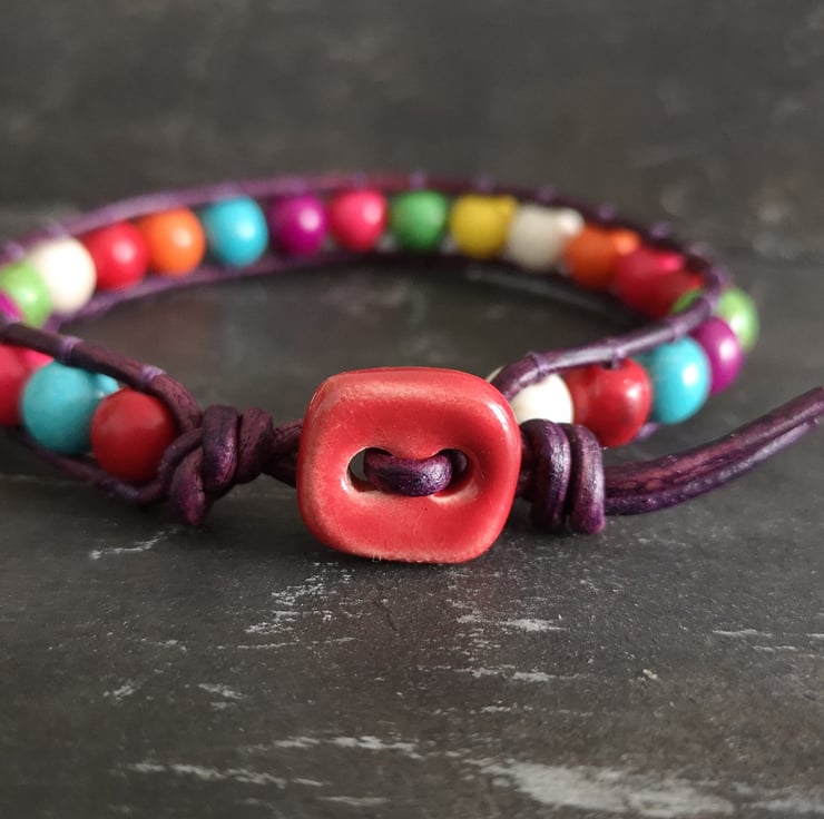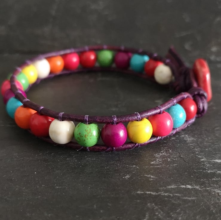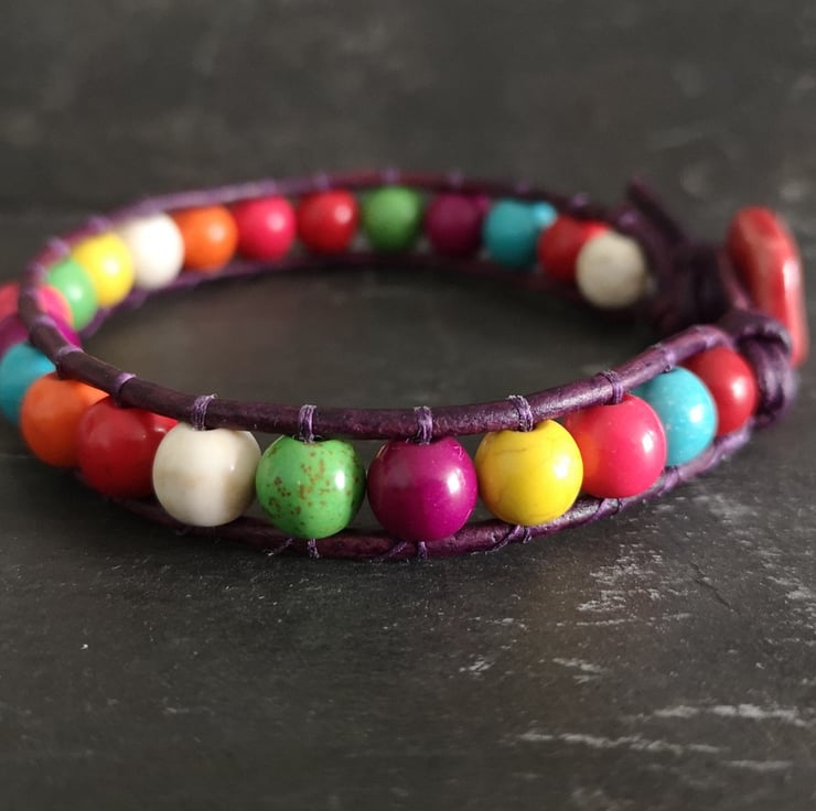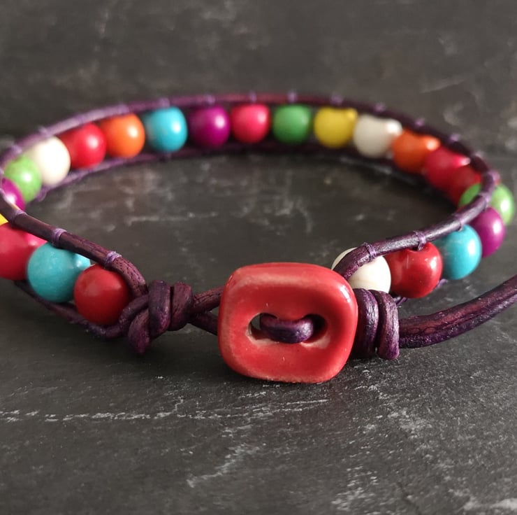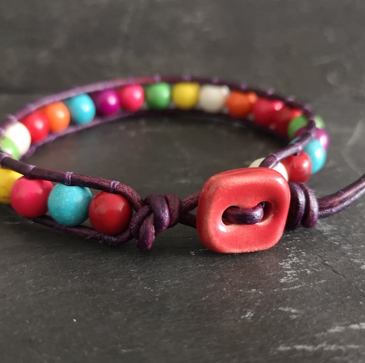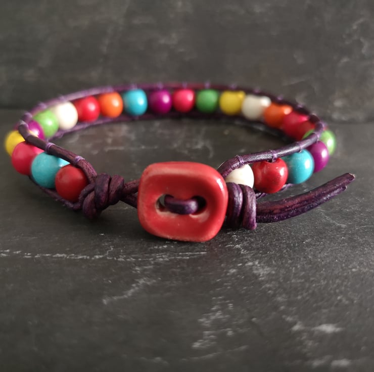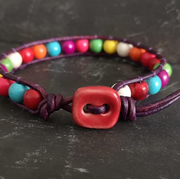 This multicoloured bracelet has been made with semi precious magnesite beads. They have been attached to dark purple leather cord and a red ceramic button has been used as a fastener.