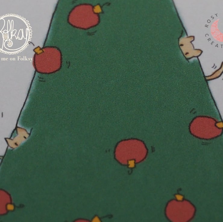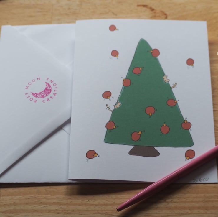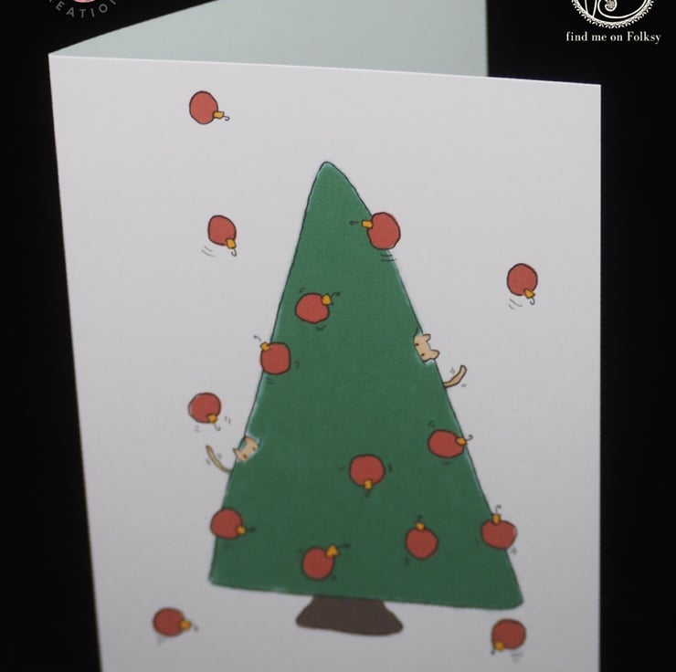 The cards have two mischievous cats rearranging the baubles on the tree.