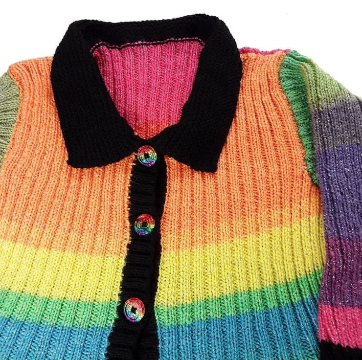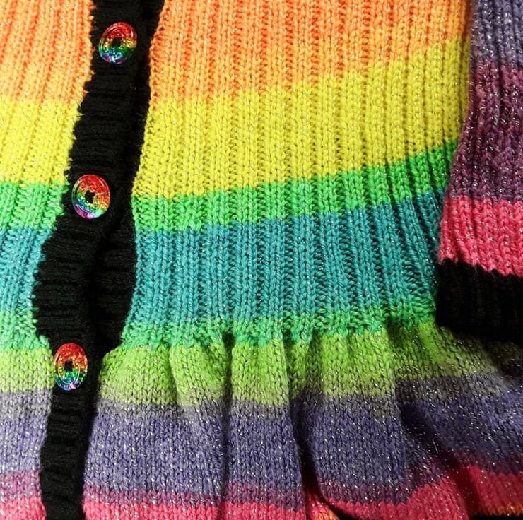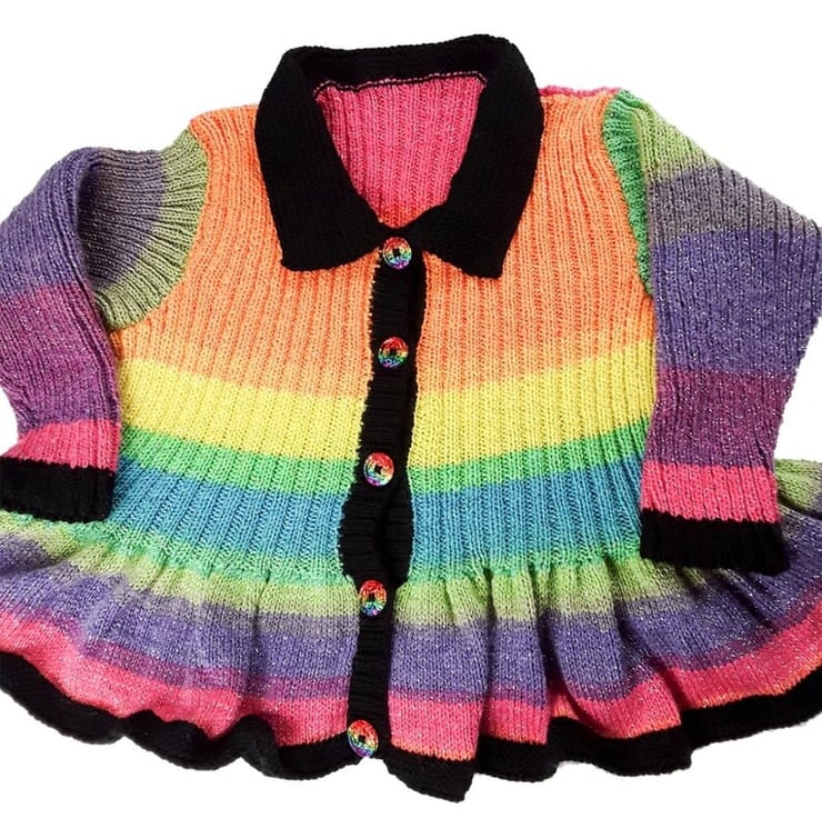 The playful design features a peplum silhouette, adding a charming twist to the traditional cardigan. Black cuffs, hemline, button bands, and collar provide a stylish contrast, enhancing the allure of the vibrant rainbow stripes. Each button on this cardigan is a unique, handmade sparkly rainbow button, carefully crafted by The Magpies Eye, making them little works of art in themselves.