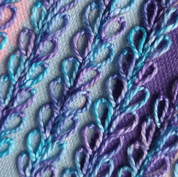 - Perle number 5 embroidery thread in blues and mauves - beautiful variegated hand-dyed yarn by Norfolk indie-dyer Sandra Beech, more than enough to complete your kit