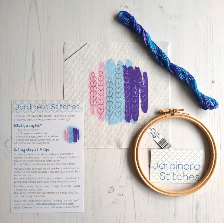 This easy-to-sew embroidery kit uses two simple stitches - stem stitch and detached chain stitch. Easy to learn if you're a beginner and fun and effective if you're a pro embroiderer.
