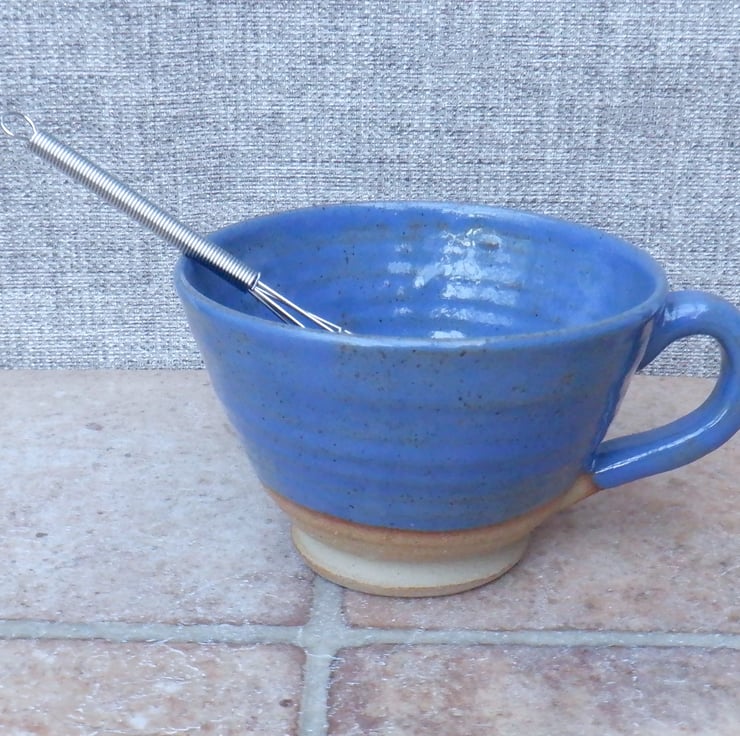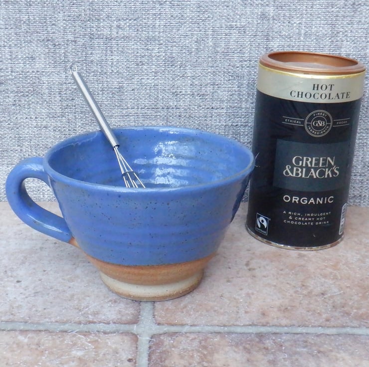 I threw this large cocoa mug on my pottery wheel using strong toasted stoneware clay, and finished it in a pretty purple mauve reactive glaze. ...my neighbour calls it periwinkle blue.