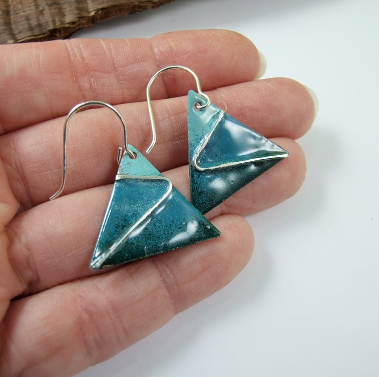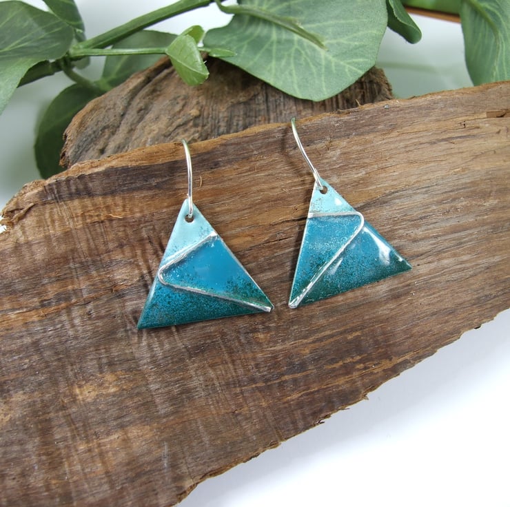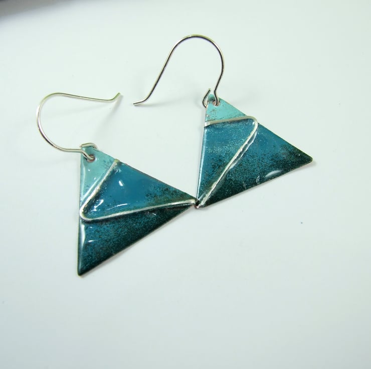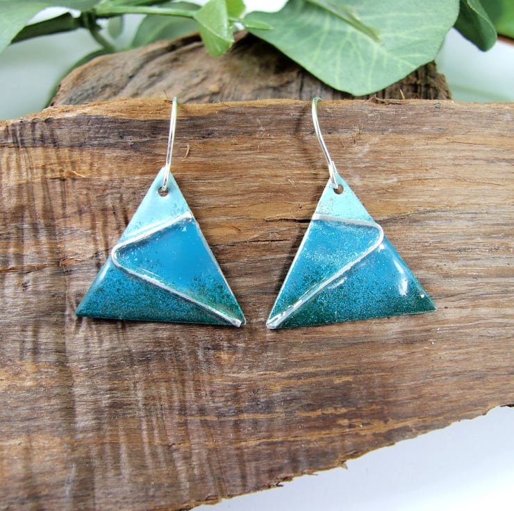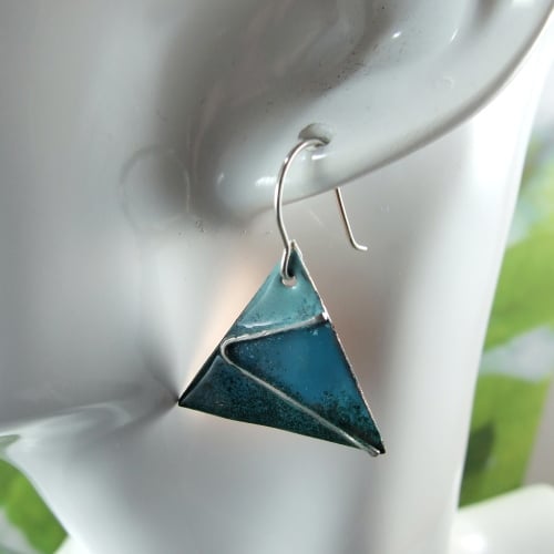 The triangle dropper shape has been cut from copper sheet by hand then enamelled in three shades of green using low temperature Efcolour enamels which are fired in a regular oven, they start out as a very fine powder which becomes liquid as it heats and sets glossy. I have embedded some silver strips into the enamel for decoration.