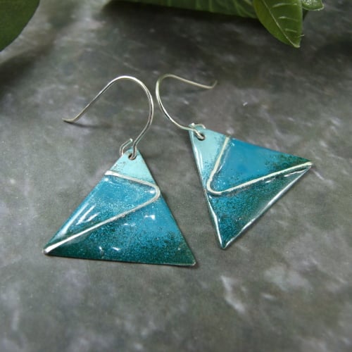 Triangle Dropper Earrings with Enamel in shades of green with sterling silver accents and earwires.