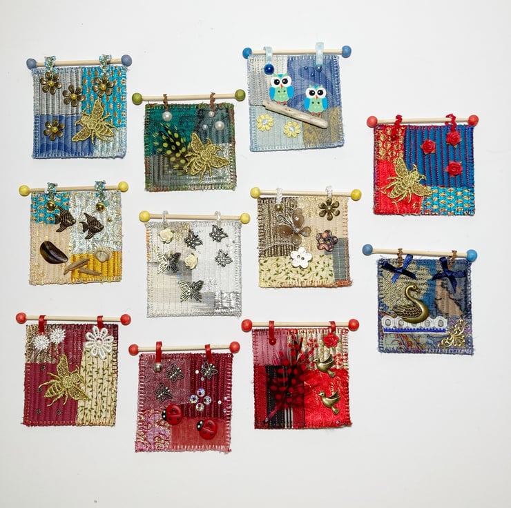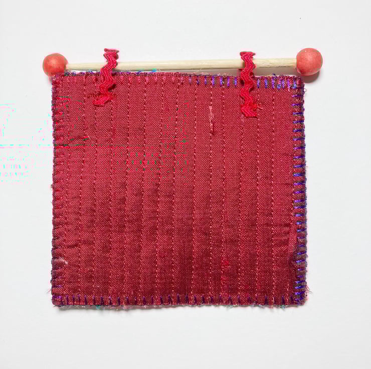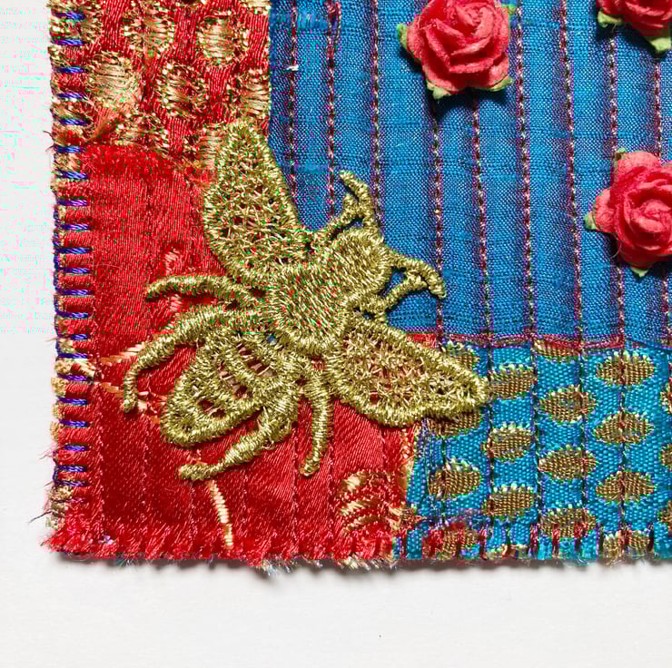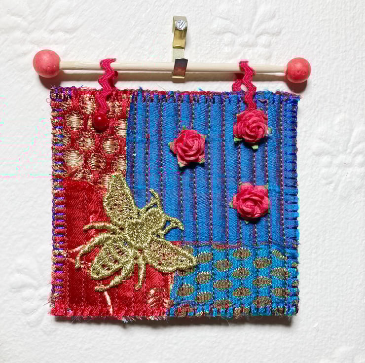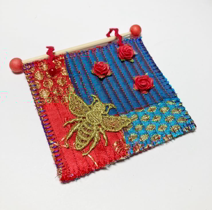 A stunning combination of rich red and blue fabrics have been used to create the quilted patchwork background for this picture. The fabric has been quilted onto a piece of felt backed with a plain piece of fabric and edged using a blanket stitch. A golden bee and red rose embellishments have been added. The finished picture measures approximately 3" x 3" and is attached to a small wooden hanging rod by means of two small loops of ribbon.