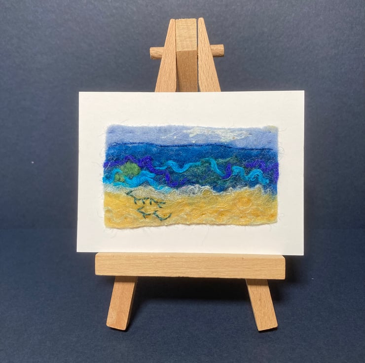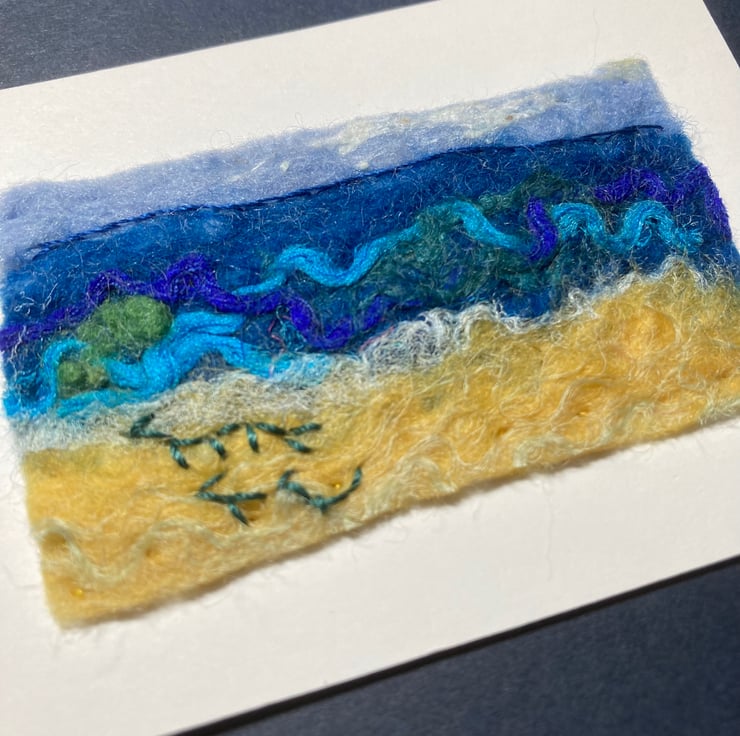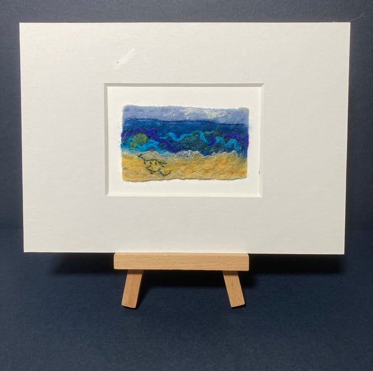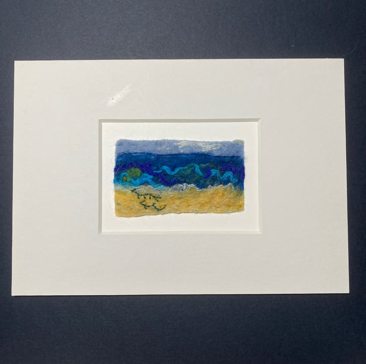 This miniature seascape has been made using a wet felting technique. Merino wool fibres from the main background and various other wool and silk fibres and small silk fabric pieces have been added to the surface prior to felting. Hand embroidery has been added to the finished piece to add additional detail and enhance the picture. The final felted piece has then been mounted on a piece of white card measuring 3.5" x 2.5", the size of an ACEO. The photographs show both the final piece and also the piece displayed in a 5” x 7” mount (not included). The picture will be shipped with a small envelope to enable it to be given as a gift.