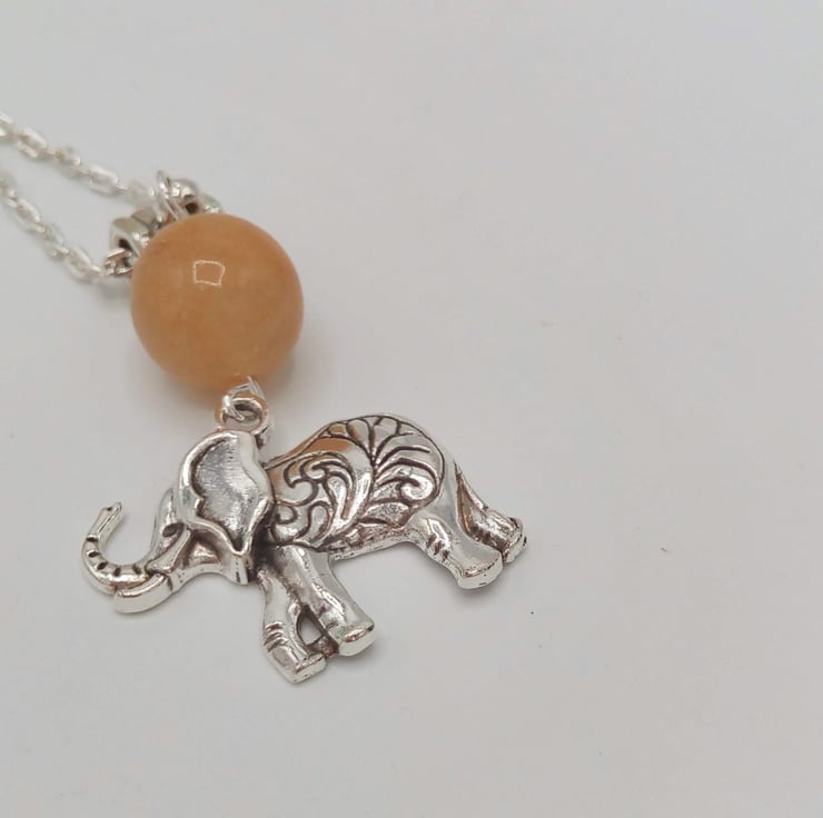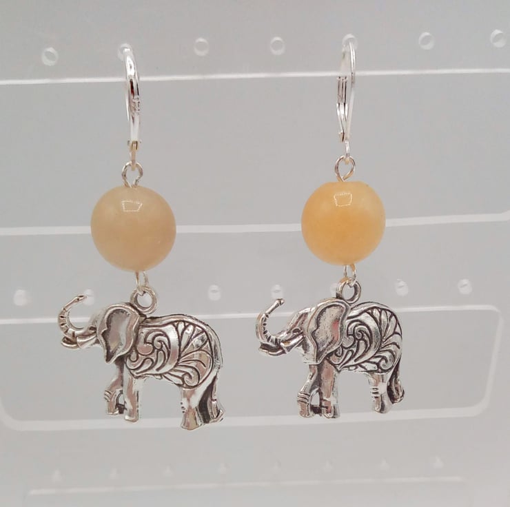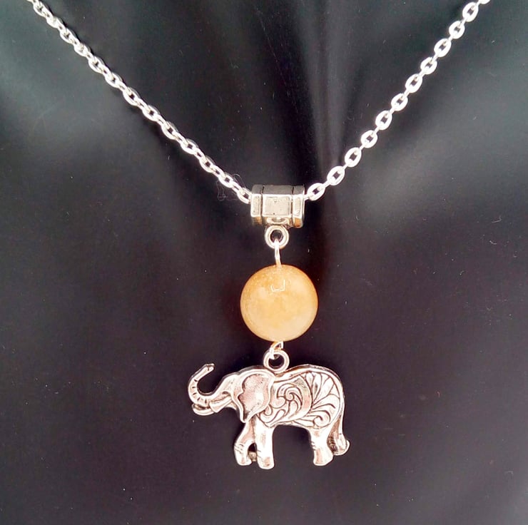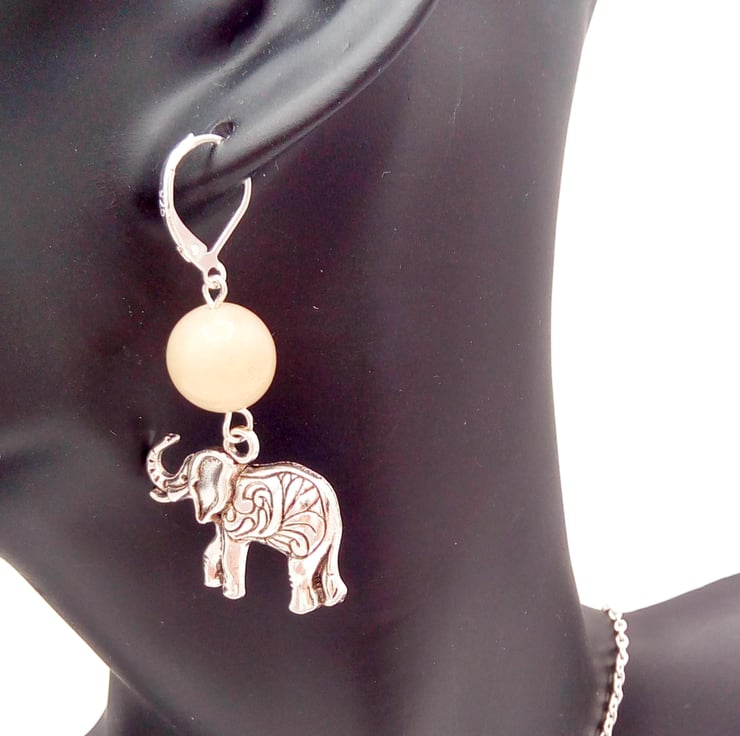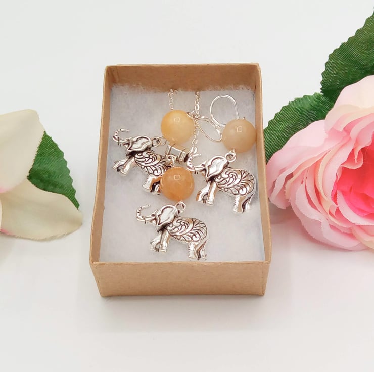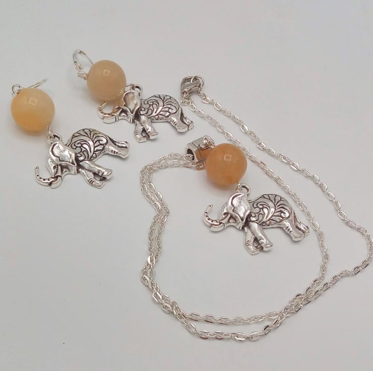Honey Jade and Silver Plated Elephant Charm Necklace and Earrings, Honey Jade Jewellery Set, Gift for Her, Birthday Gift, Anniversary Gift, Semi Precious Jewellery Set, Elephant Jewellery, Elephant Necklace, Elephant Earrings