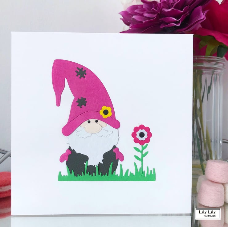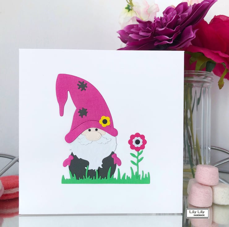 A birthday card featuring a cute garden gnome designed in bright and cheerful co-ordinating colours. The garden gnome wears a cerise coloured hat and gloves.