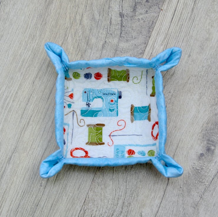They are made using a mixture of fabric featuring sewing essentials on a white background and macaroons on a cream background. They are then quilted with an eco-friendly wadding (made from recycled plastic bottles) to give the box some shape. The edges are bound using a light blue fabric. Finally, close to the corners are four metal snap fasteners holding the box closed so you can store the box flat when not in use.