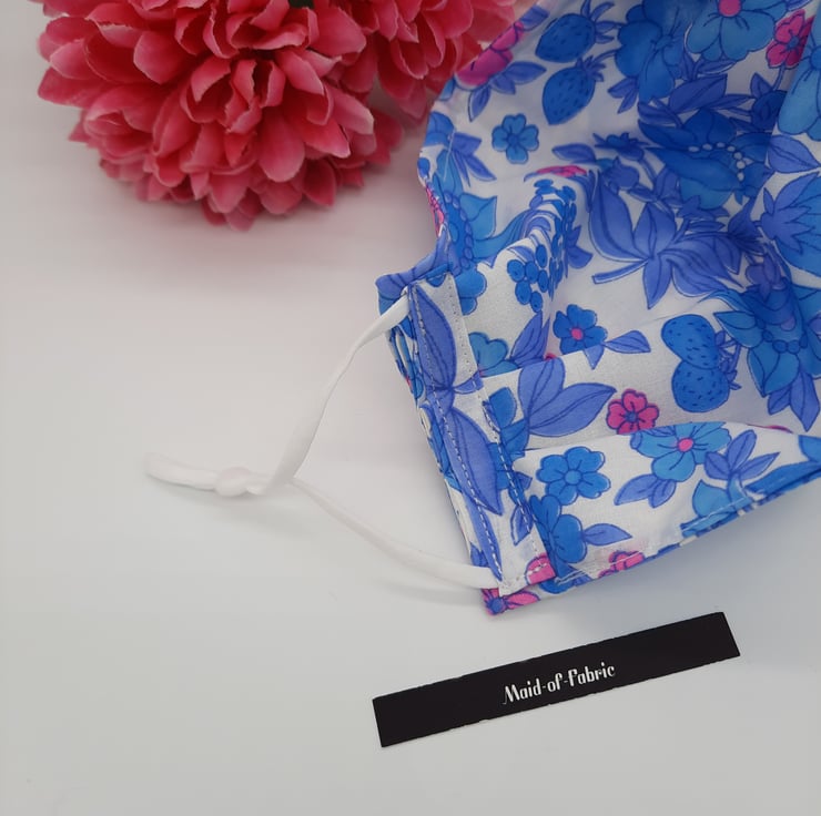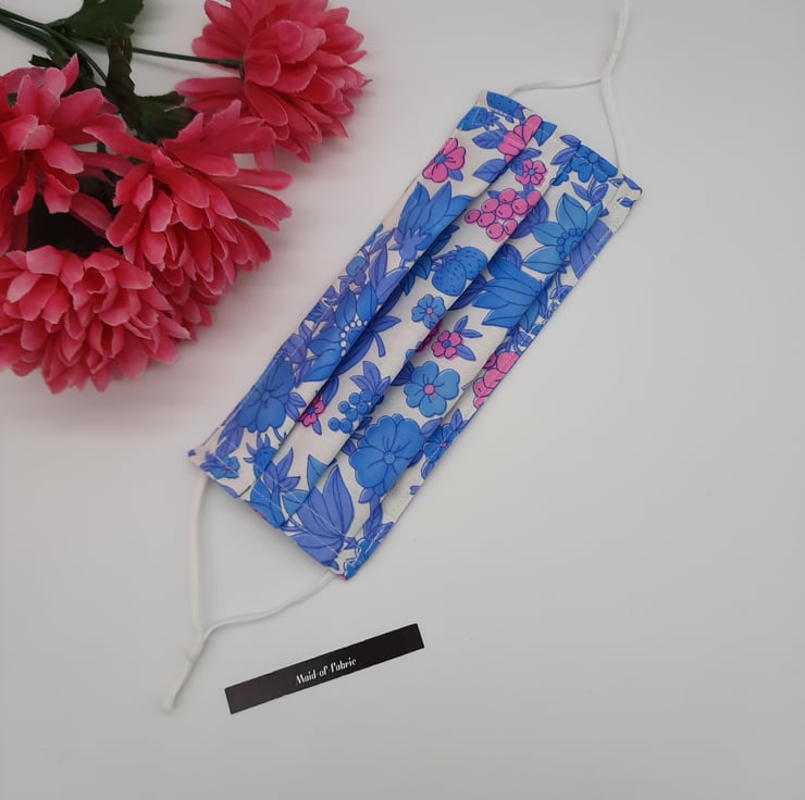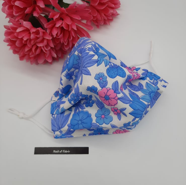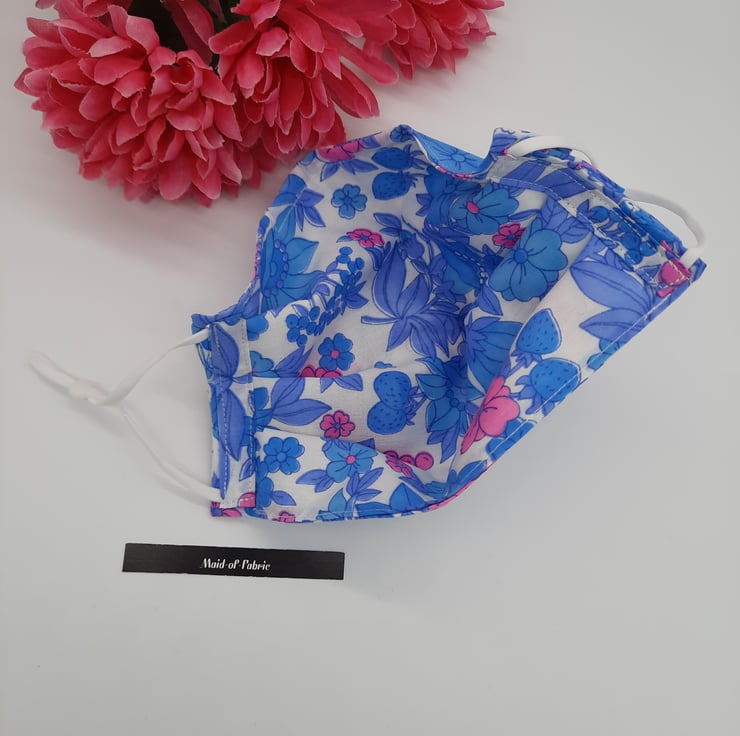 Large face mask in blue and pink floral,  adjustable with nose wire