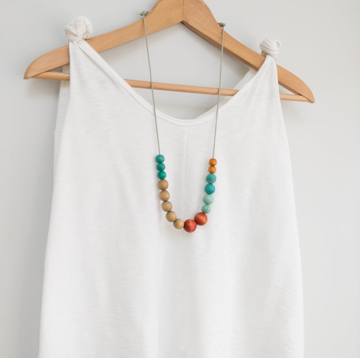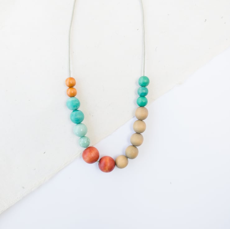 'Gretel' Is another one of my small beaded necklaces in blue-green, tan, rust and natural. It consists of fourteen upcycled wooden beads and two ceramic beads. The small pale blue ceramic bead has a lovely crackle to it and is only 1cm in size. It's very light weight and easy to wear. The necklace length can easily be adjusted by using the sliding knots.