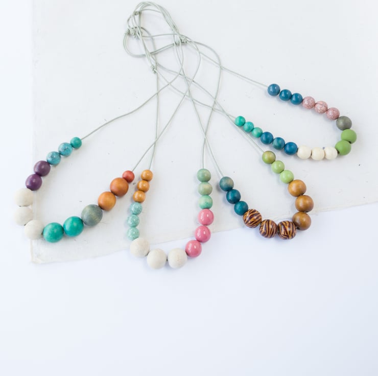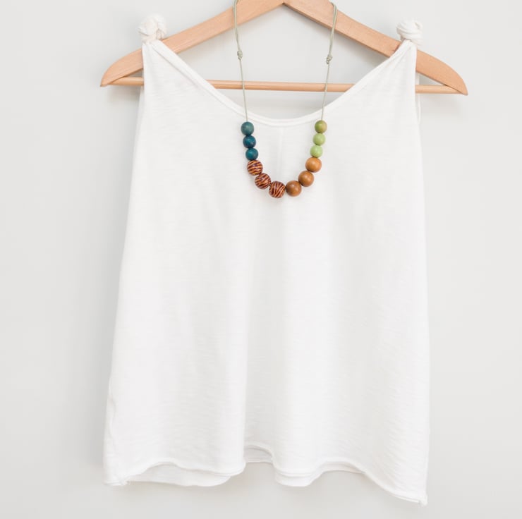 Tigi' is a wooden bead necklace made up of 12 upcycled beads in prussian blue, apple green and golden brown, including three fun zebra print beads in brown. It's very light to wear and looks great with white and denim. The cord is adjustable to your desired length by using the sliding knots.