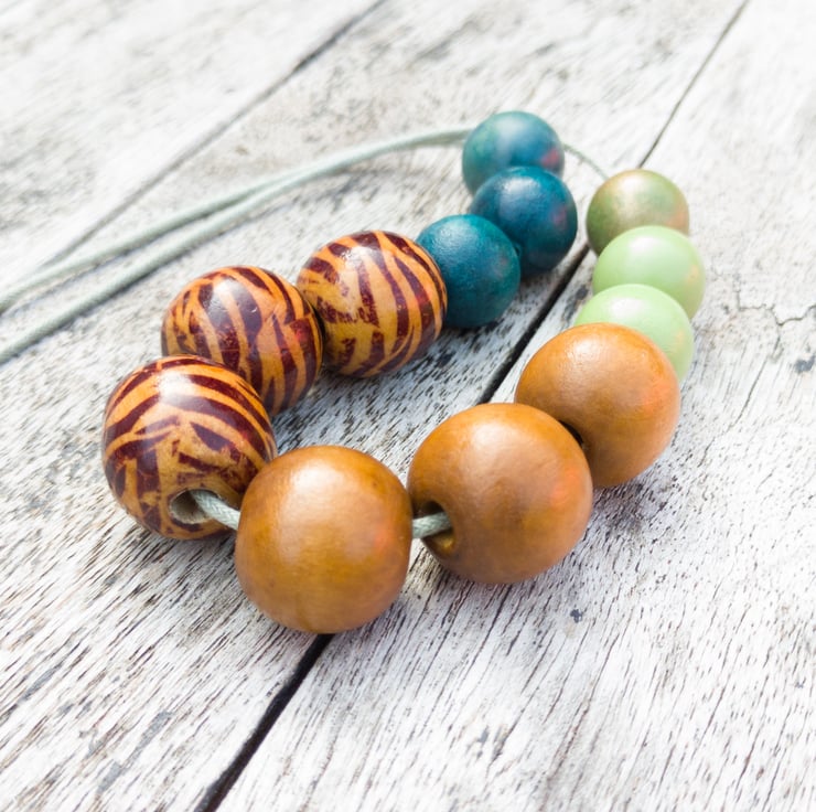 Tigi - Wooden bead necklace, green, blue and golden brown with zebra beads